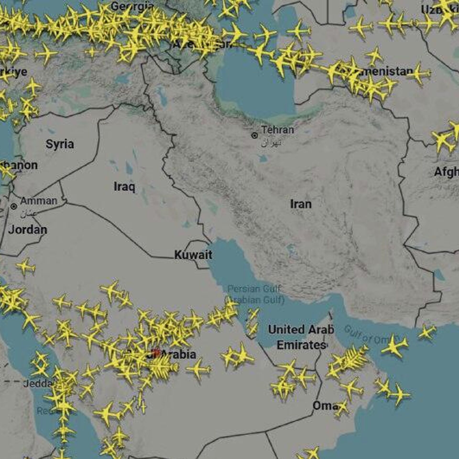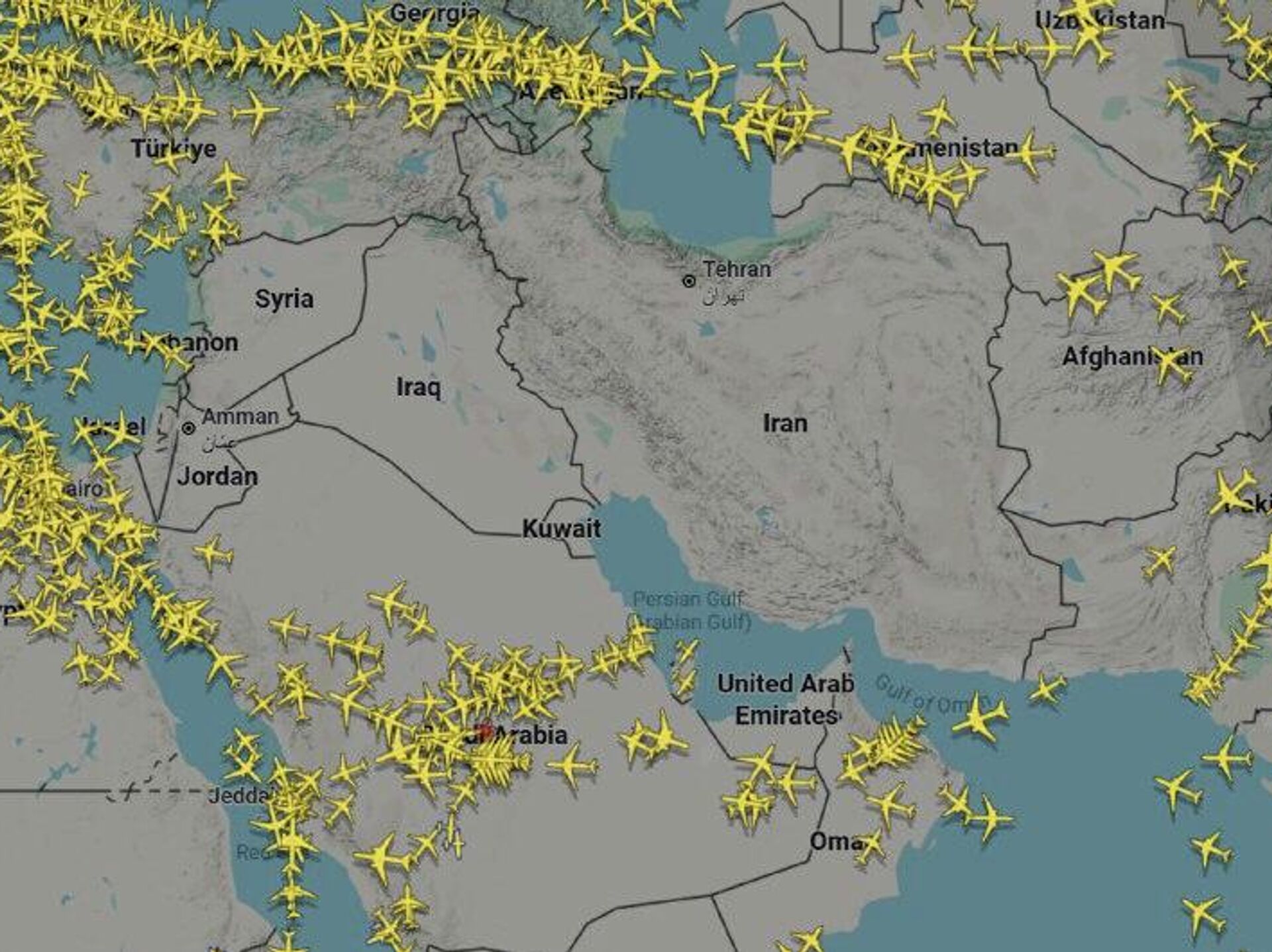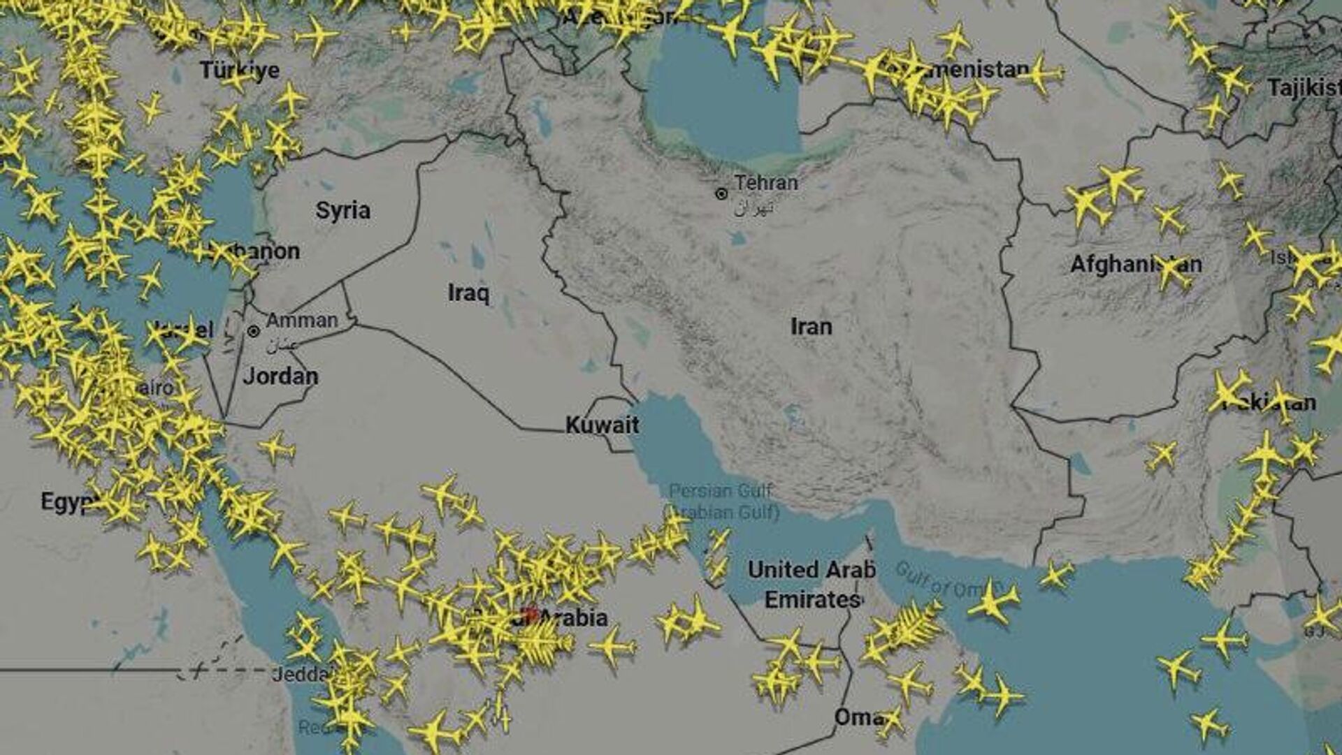 آسمان بر فراز بخش بزرگی از خاورمیانه خلوت و از پرواز خالی شده است. پروازها همچنان به مقصد فرودگاه بیروت و شماری از فرودگاههای عربستان سعودی در جریان است. با این حال، شماری از هواپیماهایی که راهی عربستان هستند، در آسمان در مدار انتظار به سر میبرند.