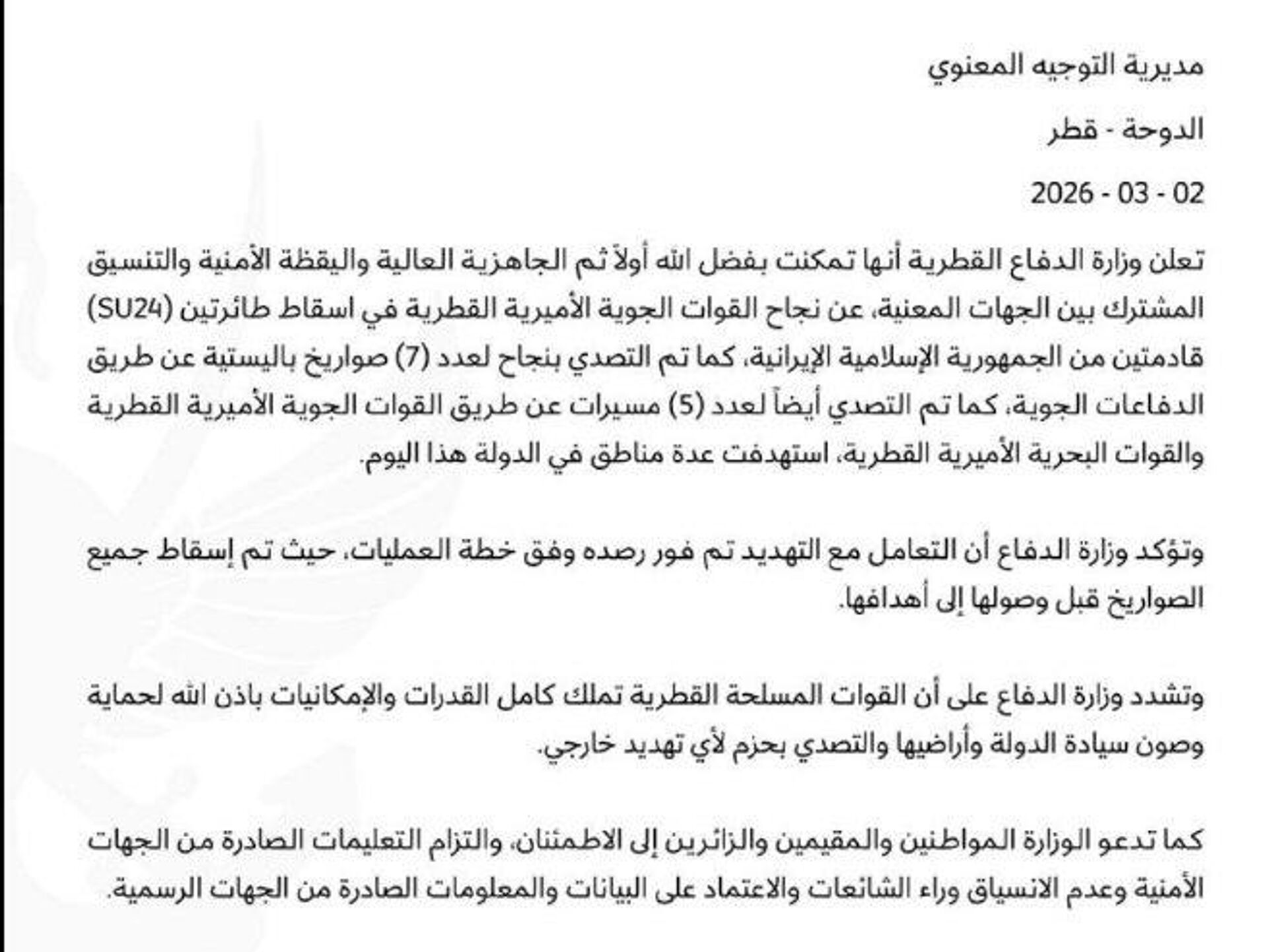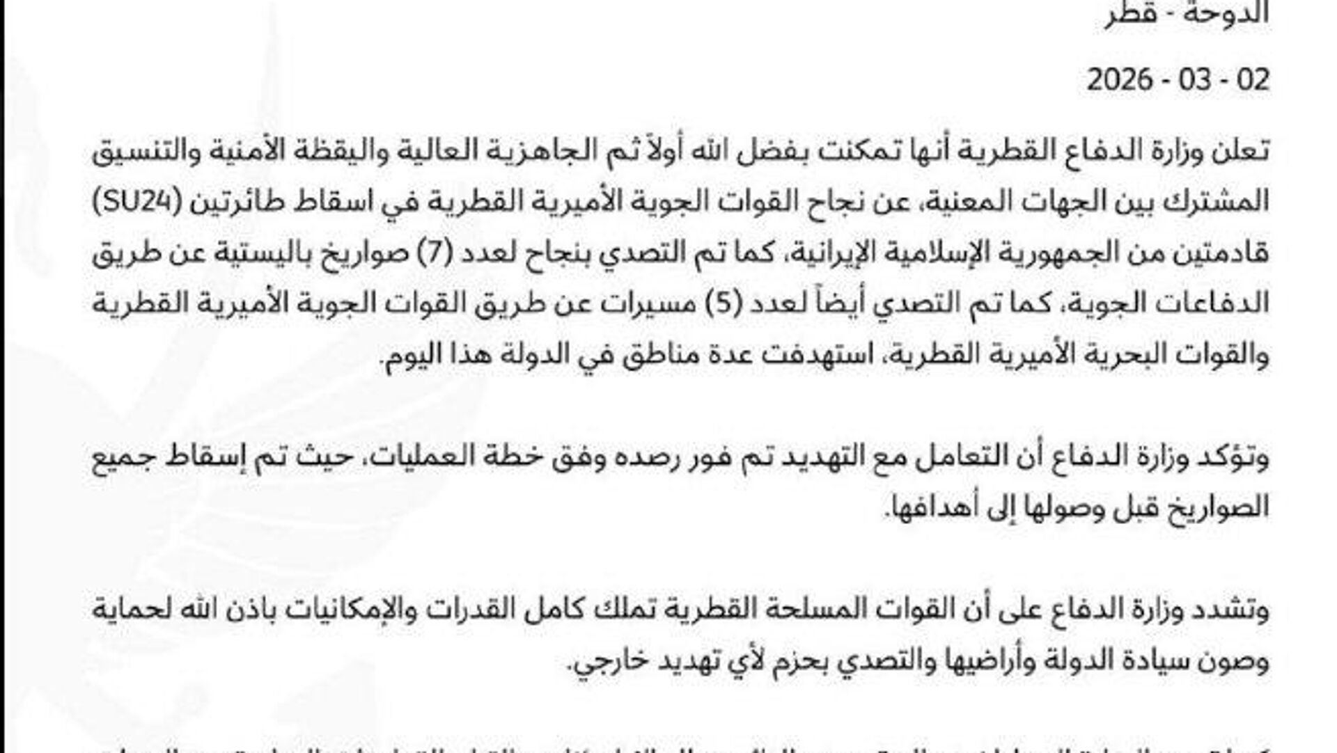 20:33 02.03.2026 (بازآوری شدن: 20:50 02.03.2026) وزارت دفاع قطر اعلام کرد که دو فروند جنگنده سوخو-24 که از حریم هوایی ایران پرواز میکردند را سرنگون کرده است
