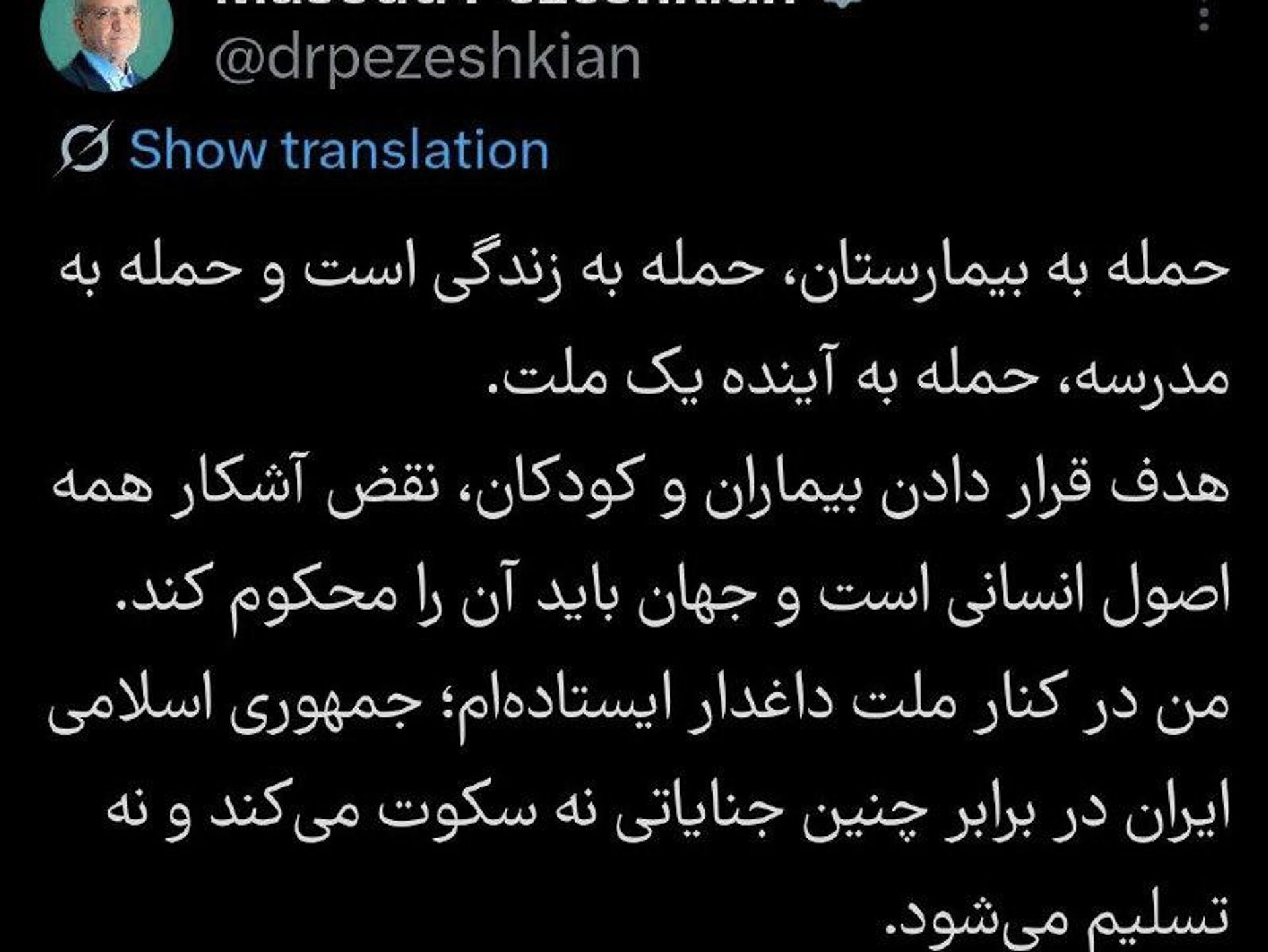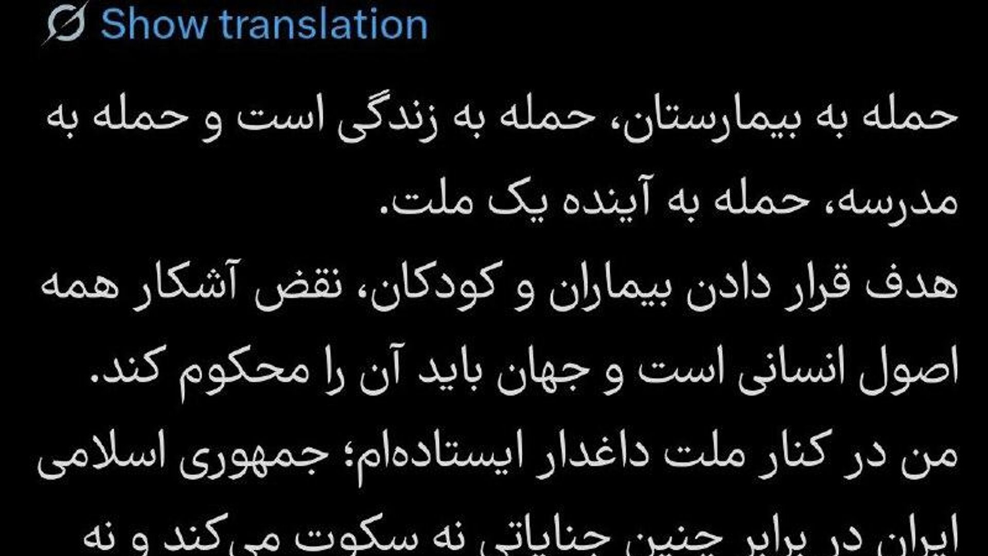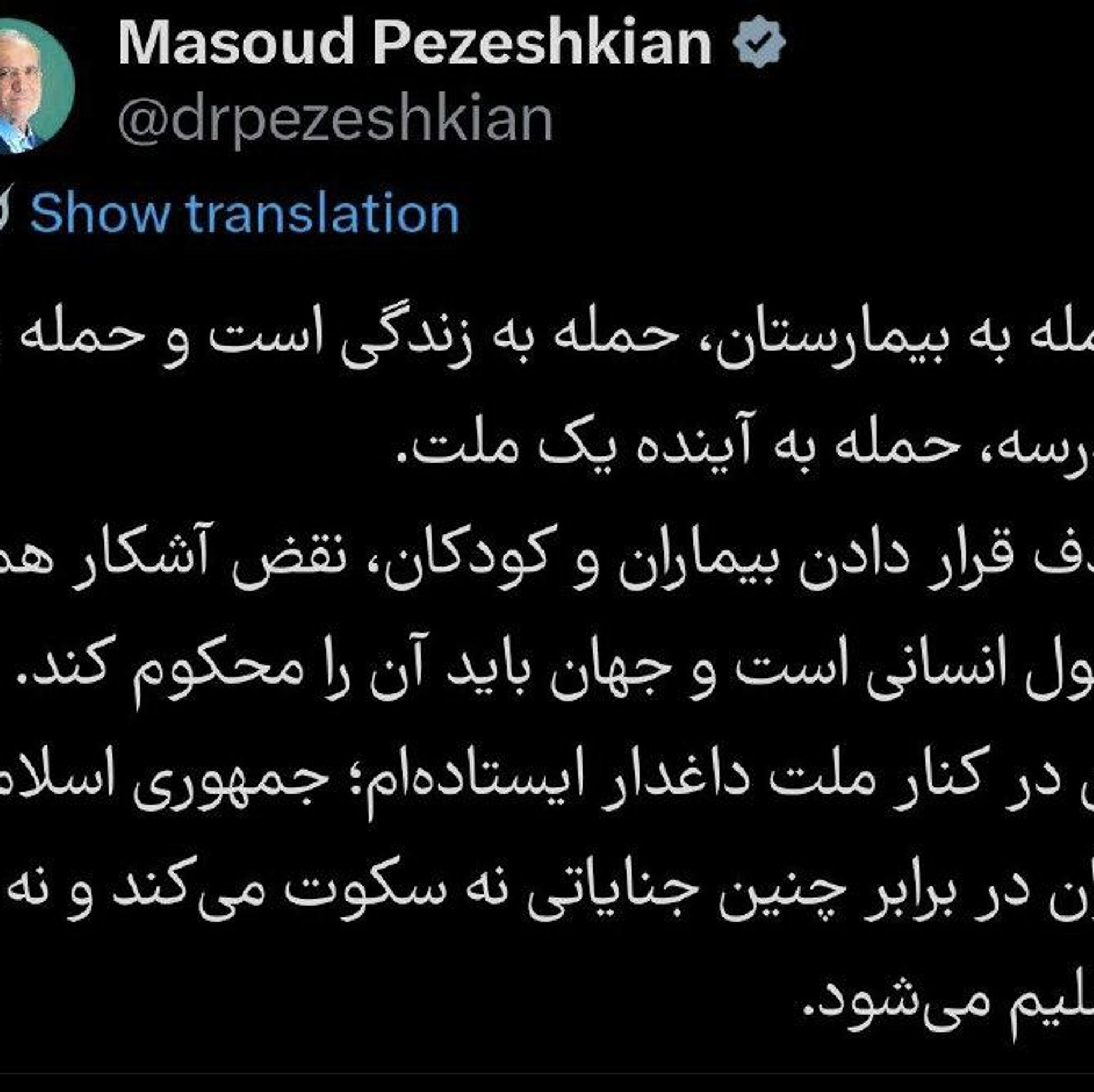 وی در پستی در ایکس نوشت: «ایران در برابر این جنایات ساکت نخواهد ماند و تسلیم نخواهد شد و من در کنار ملت داغدارم ایستادهام.»