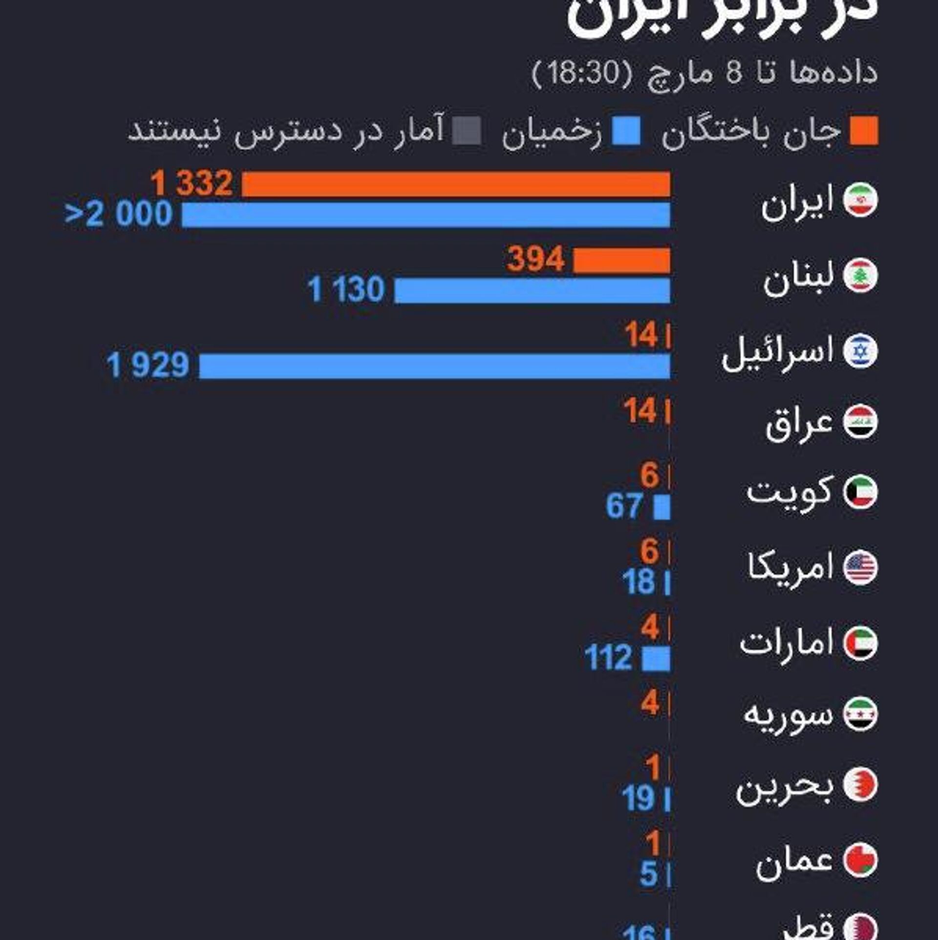 23:03 08.03.2026 (بازآوری شدن: 23:30 08.03.2026) شمار قربانیان عملیات نظامی امریکا و اسرائیل بر ایران