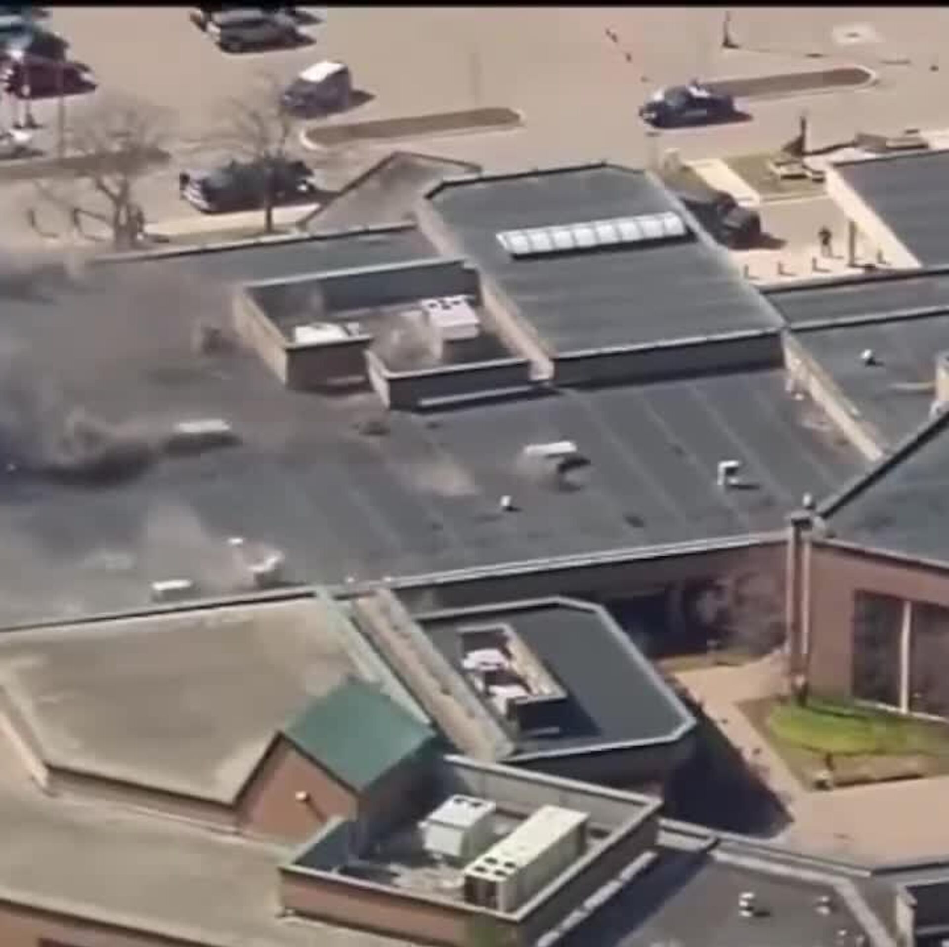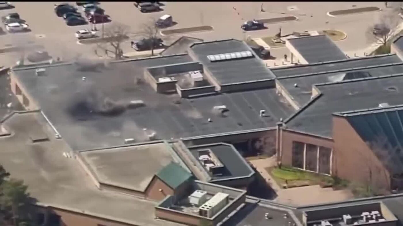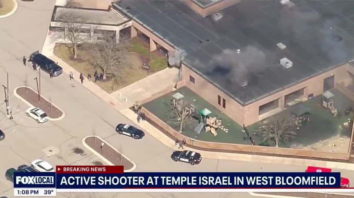 یک مهاجم ناشناس با موتر به کنیسهای در میشیگان حمله کرد و سپس آتش گشود. دود در محل حادثه قابل مشاهده است.