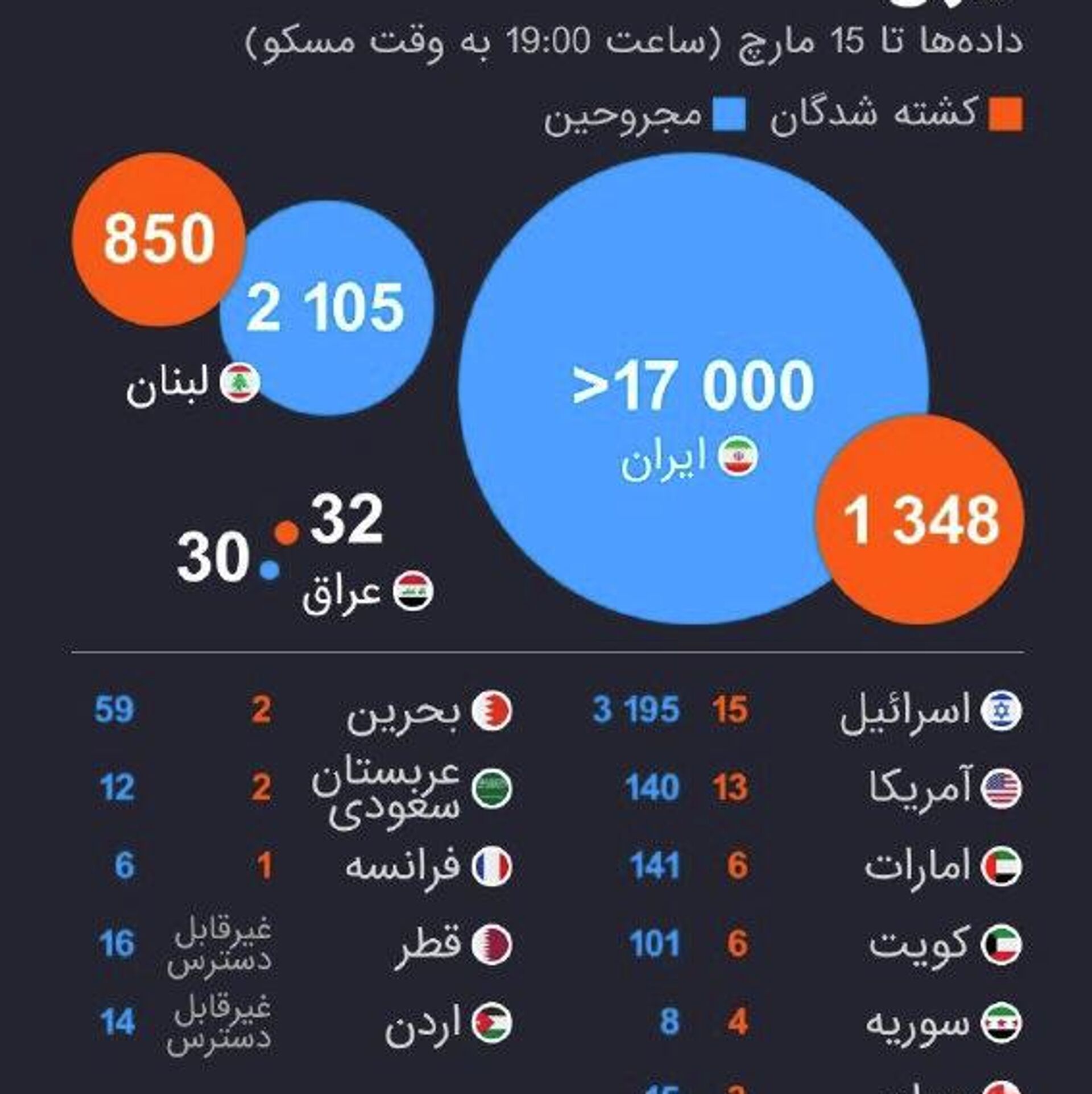 22:05 15.03.2026 (بازآوری شدن: 22:10 15.03.2026) شمار قربانیان عملیات نظامی در برابر ایران