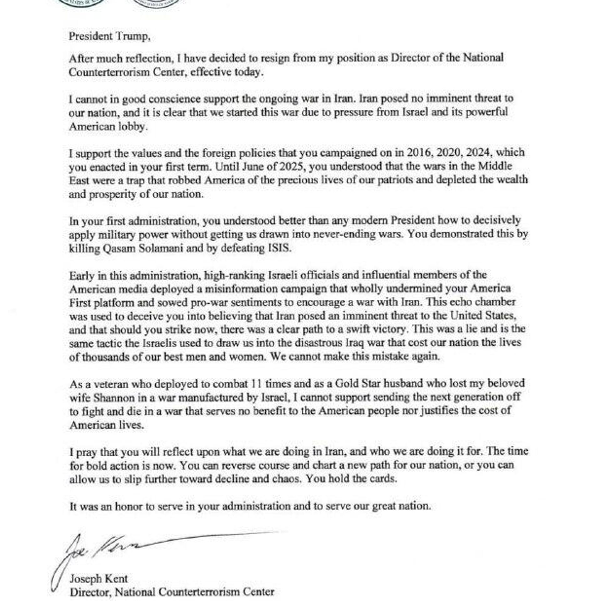 جو کنت، رئیس مرکز ملی مبارزه با تروریسم امریکا، اعلام کرد، که به دلیل مخالفت با عملیات نظامی واشنگتن بر ایران، از سمت خود کنارهگیری میکند.