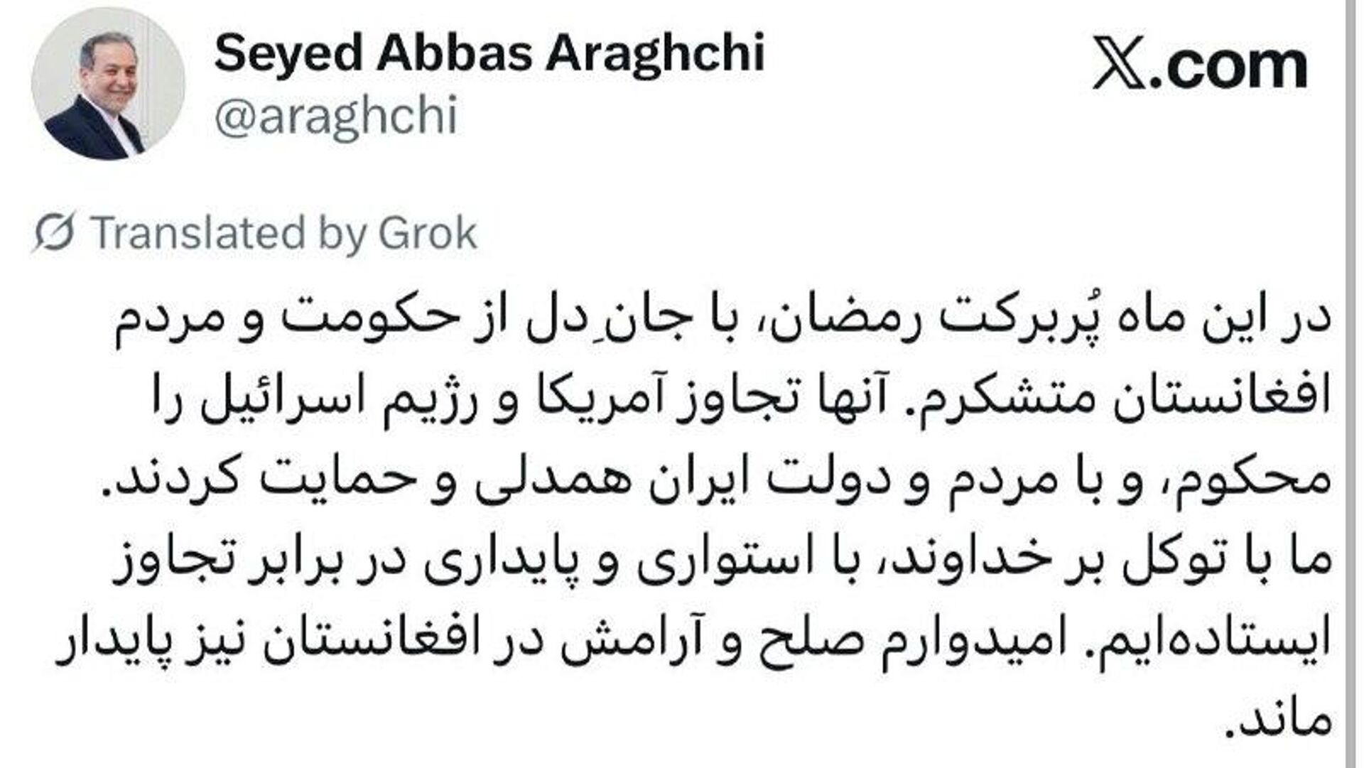 وزیر خارجه ایران میگوید تهران از حکومت و مردم افغانستان که «تجاوز امریکا و رژیم اسراییل را محکوم» و با مردم و دولت ایران ابراز همدلی و حمایت کردهاند، سپاسگزار است.