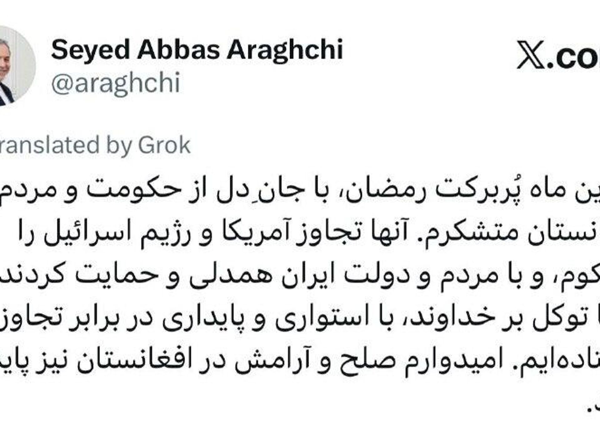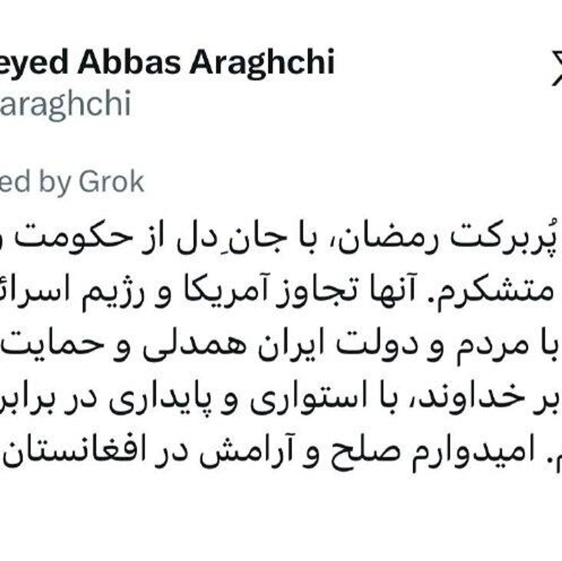 سید عباس عراقچی در صفحه ایکس خود نوشته است که امیدوار است صلح و آرامش در افغانستان پایدار بماند.