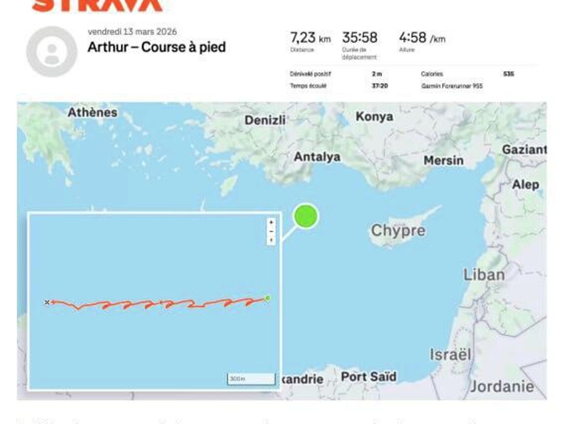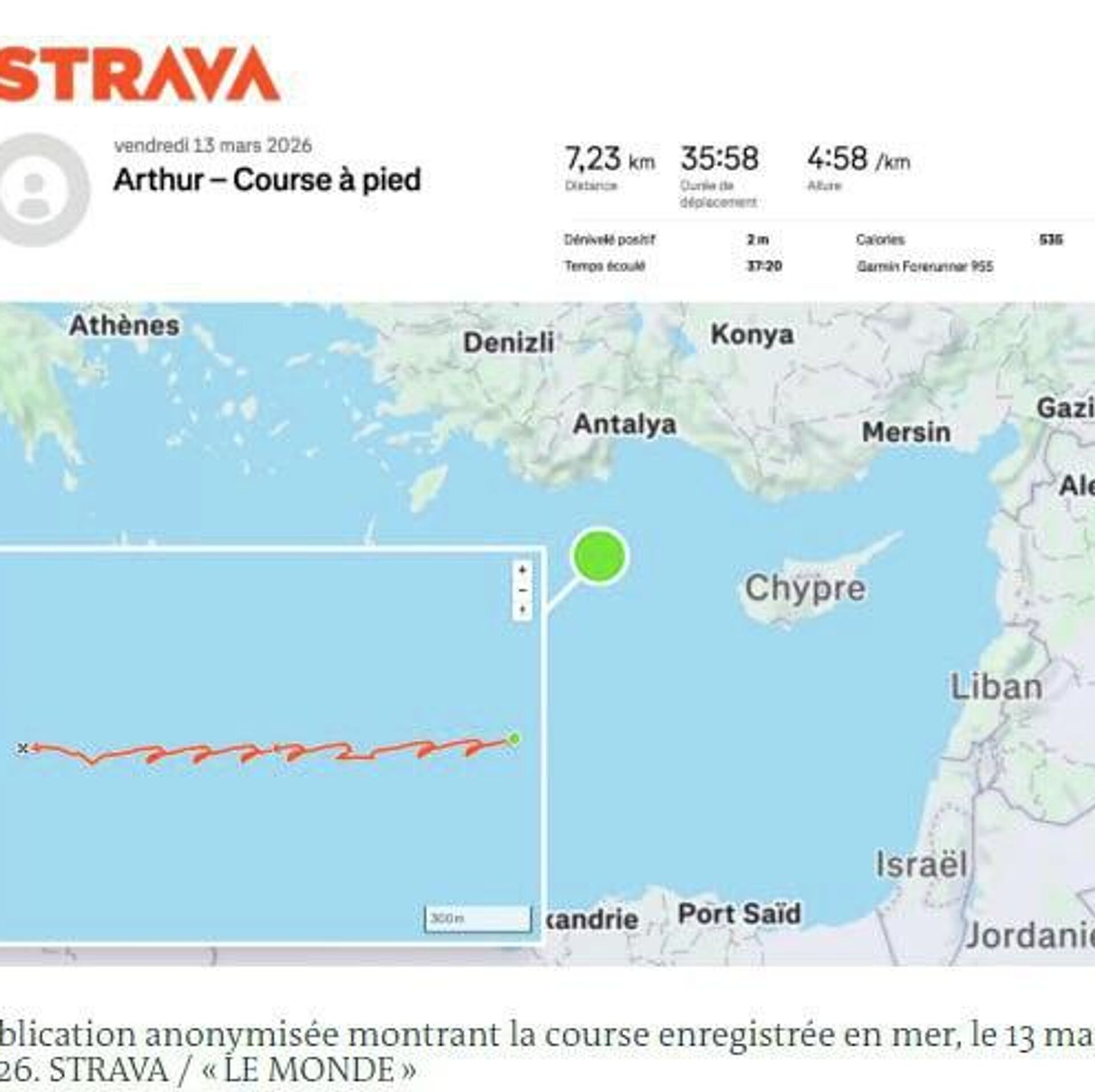 ◻این سرباز اطلاعات تمرین خود را در سرویس ردیابی دویدن و فعالیت منتشر کرد و ضبط آن که در دریا انجام شد، امکان تعیین مختصات کشتی در دریای مدیترانه در نزدیکی قبرس را فراهم کرد.