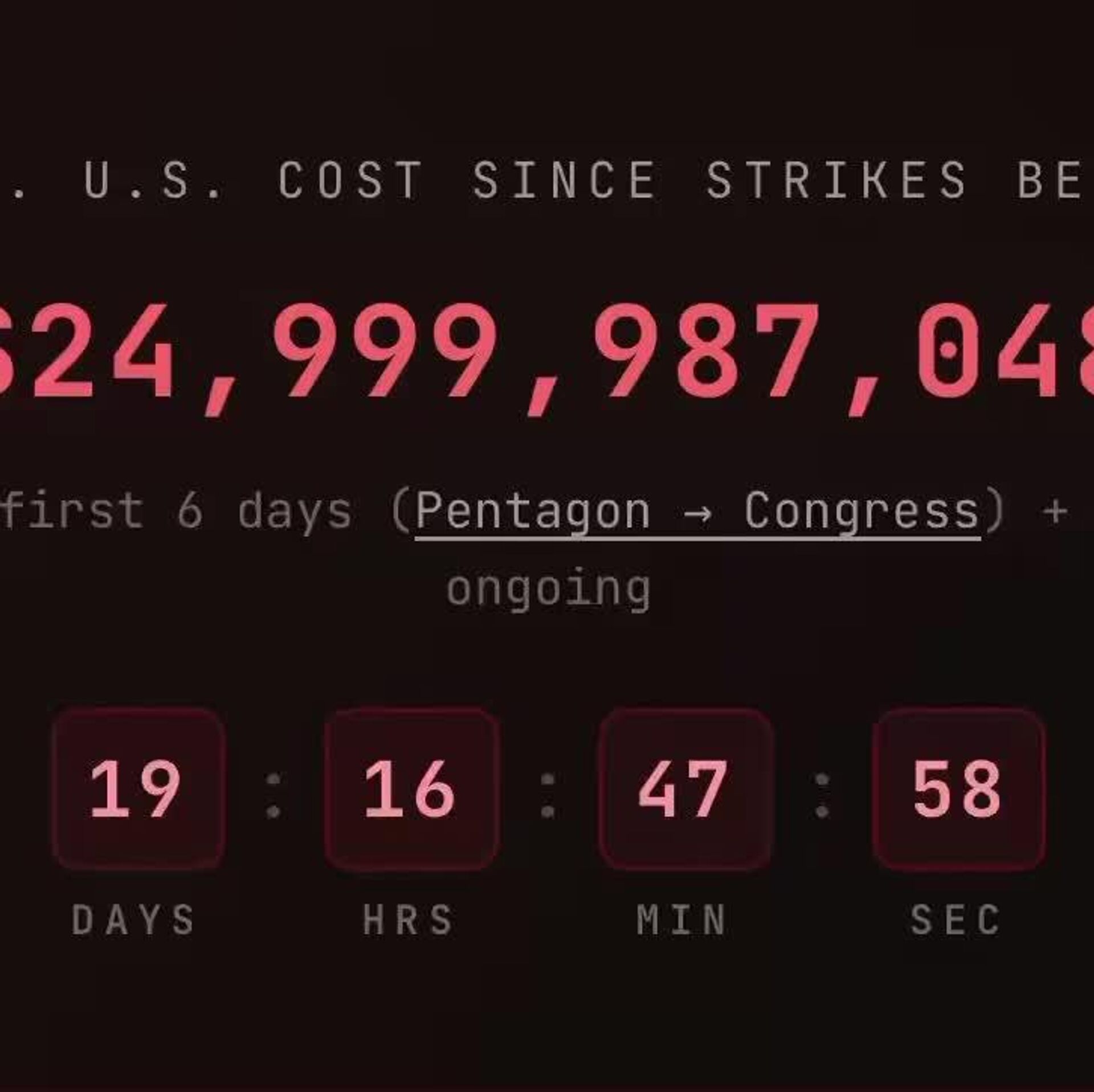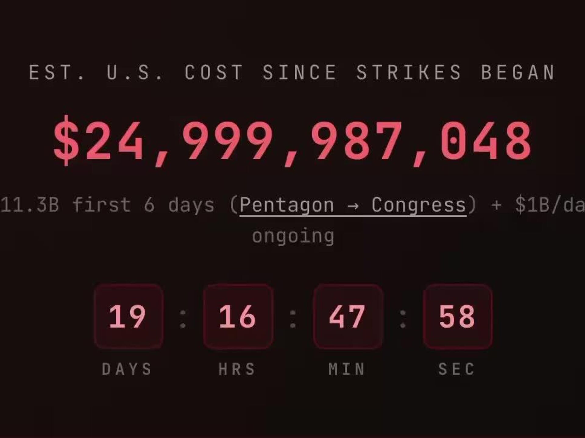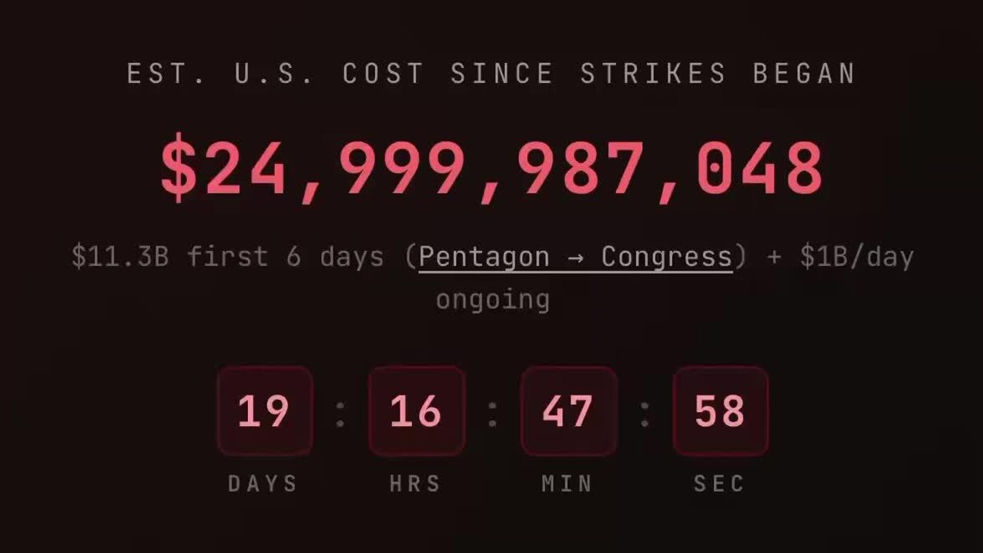 ◻ تا 20 مارچ، هزینهها بر اساس ردیاب هزینه جنگ ایران بهصورت لحظهای از 25.5 میلیارد دالر فراتر رفته است.