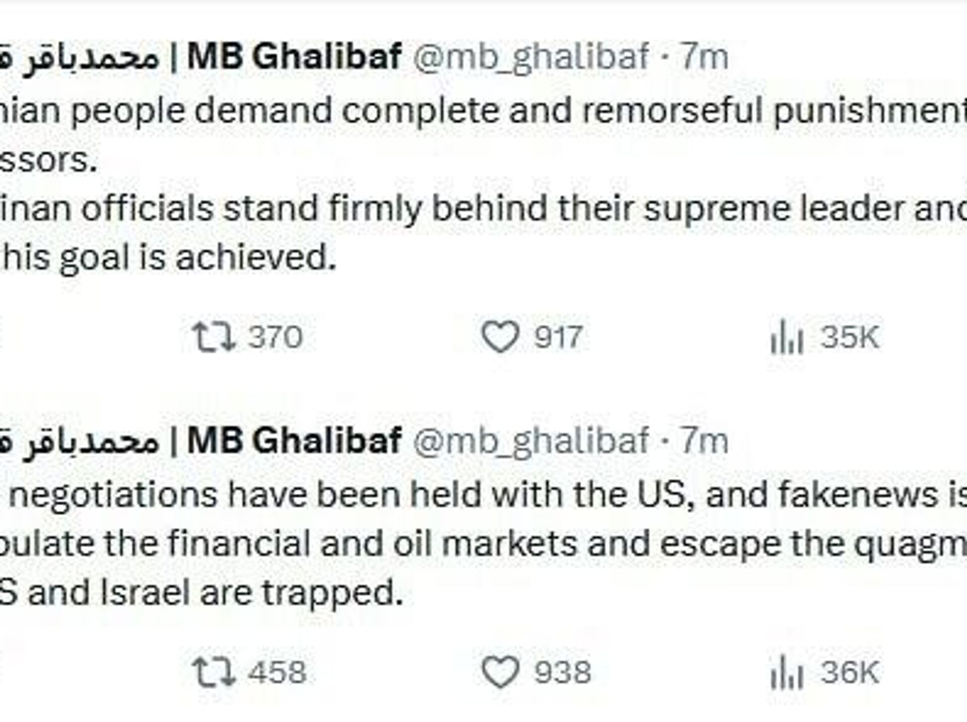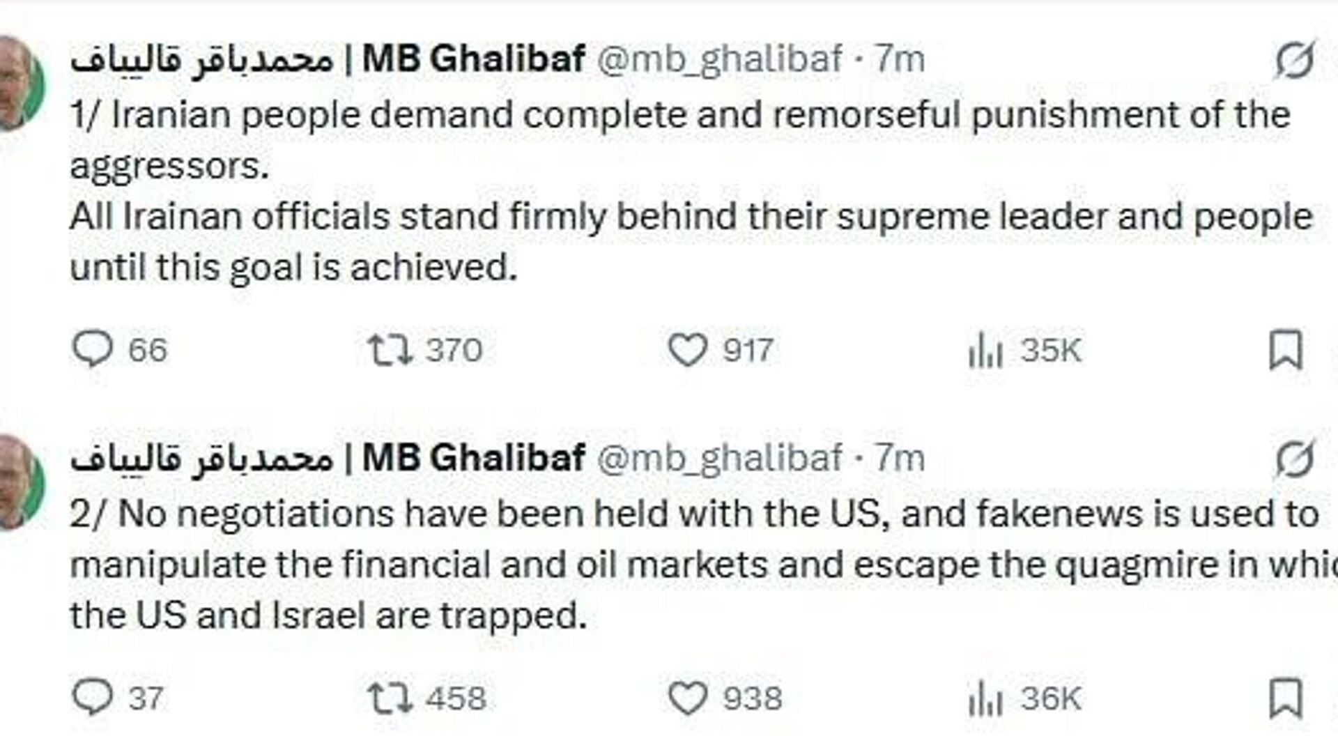 ◻محمدباقر قالیباف، رئیس مجلس ایران گفت، هیچ مذاکره ای با آمریکا انجام نشده است؛ فیکنیوزها برای فرار از باتلاقی است که آمریکا و اسرائیل در آن گیر افتادهاند.