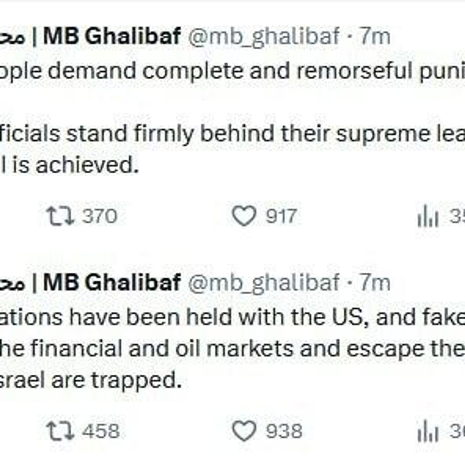 رئیس مجلس ایران در شبکه اجتماعی "ایکس" نوشت: " مردم ما خواهان تنبیه کامل و پشیمان کنندهٔ متجاوزان هستند. همهٔ مسئولین تا رسیدن به این هدف پشت سر رهبر و مردم خود محکم ایستادهاند."