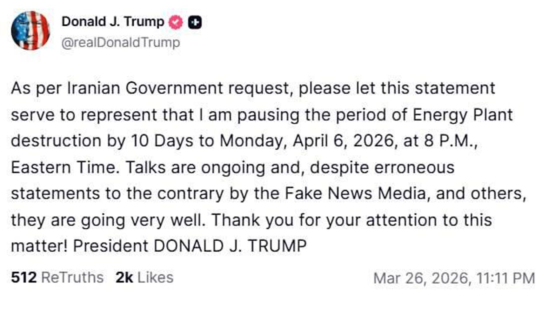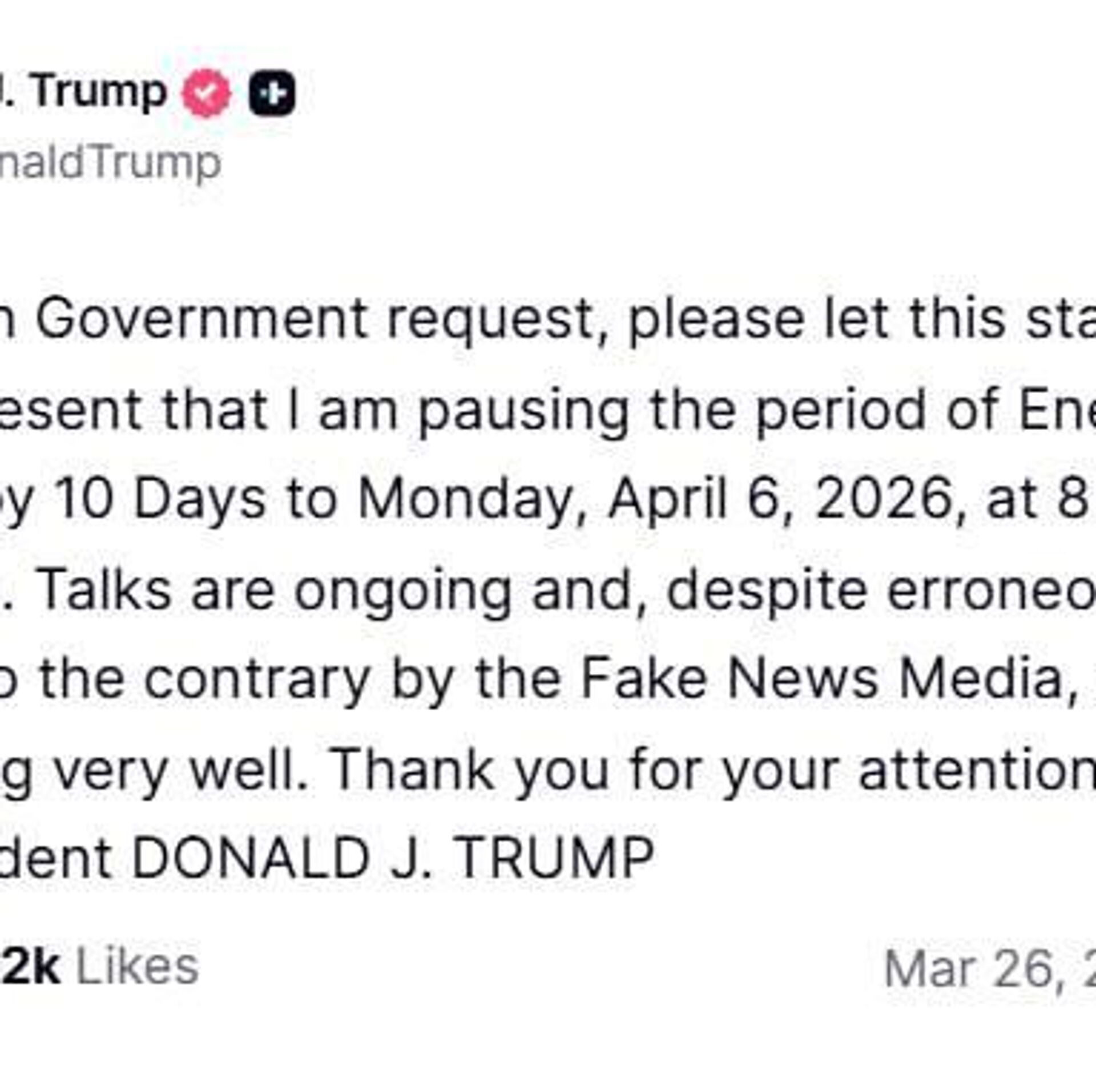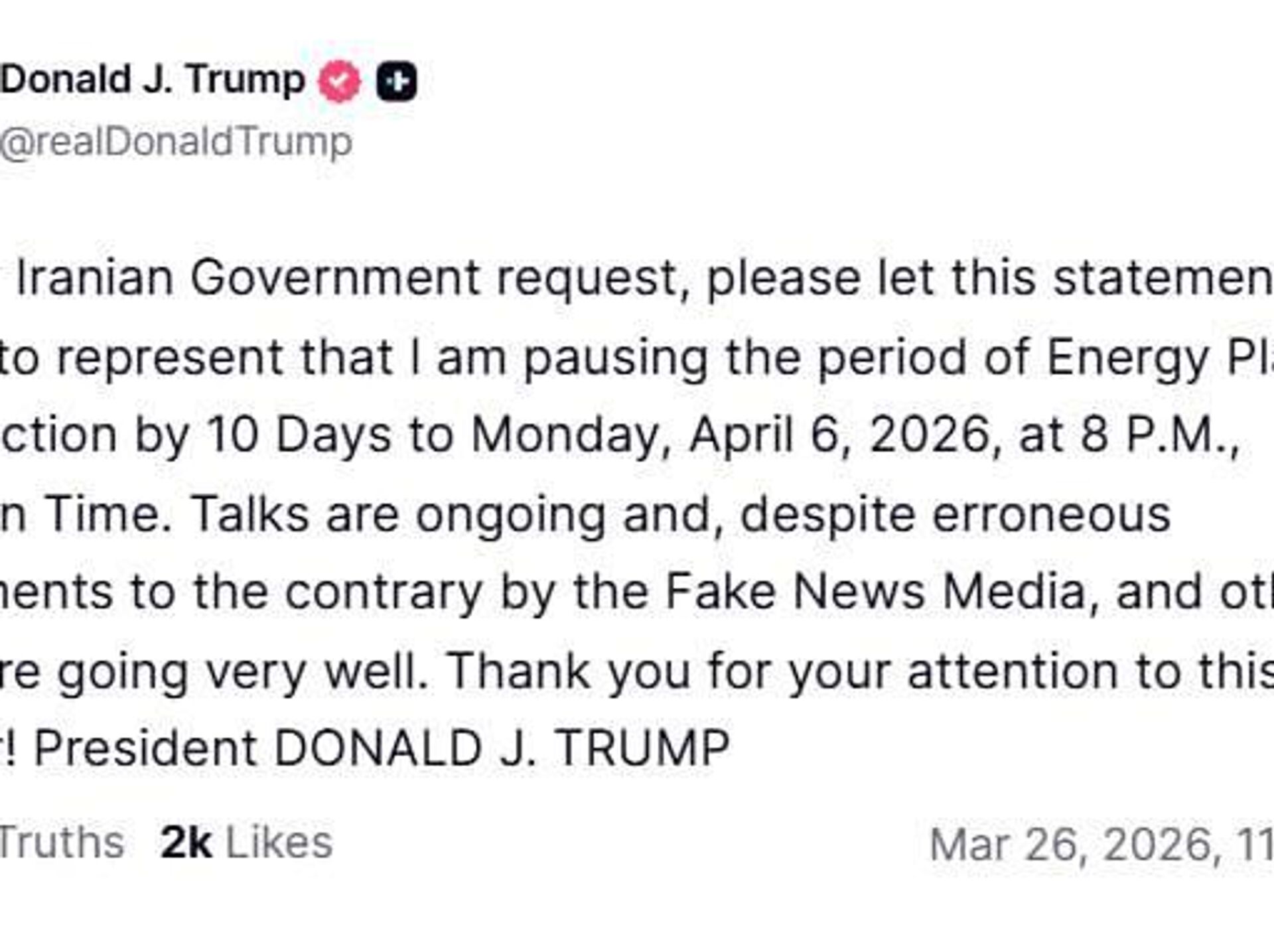 دونالد ترامپ، رئیس جمهور آمریکا، با استناد به آنچه که «درخواست» دولت ایران توصیف کرد، گفت که حملات به زیرساختهای انرژی ایران را به مدت 10 روز متوقف میکند.