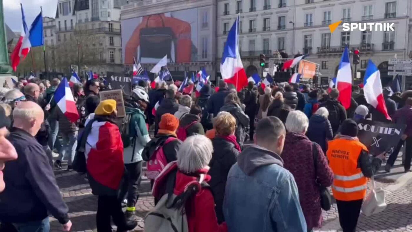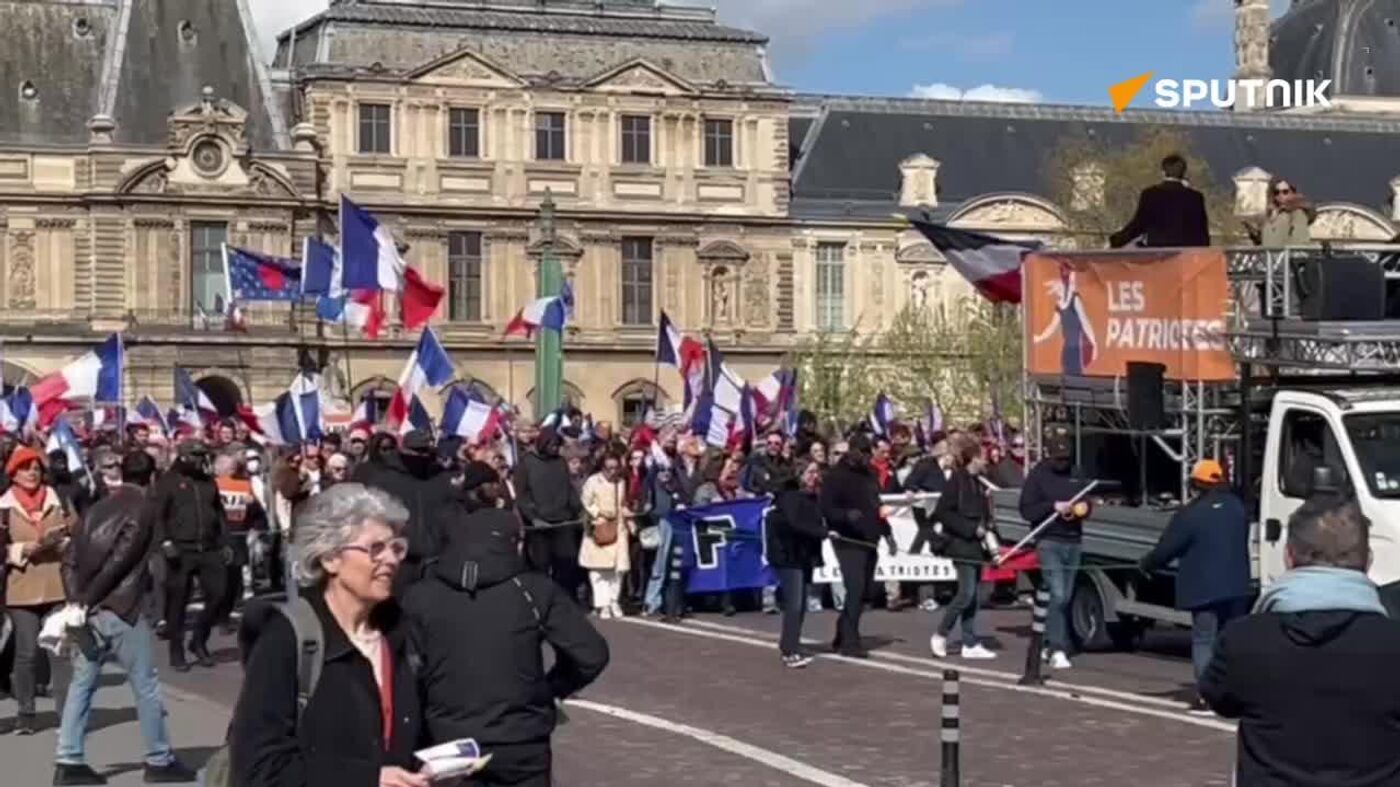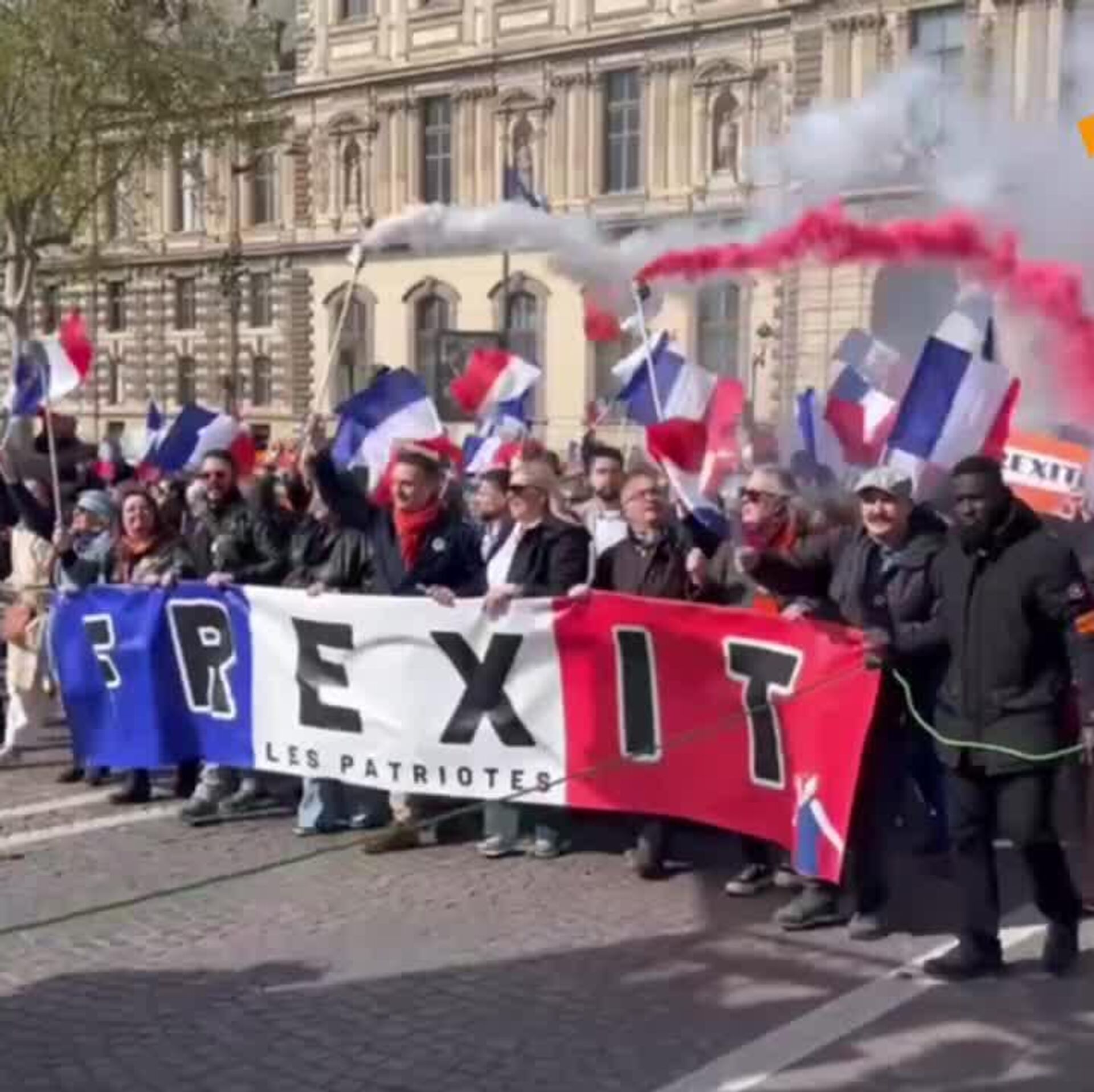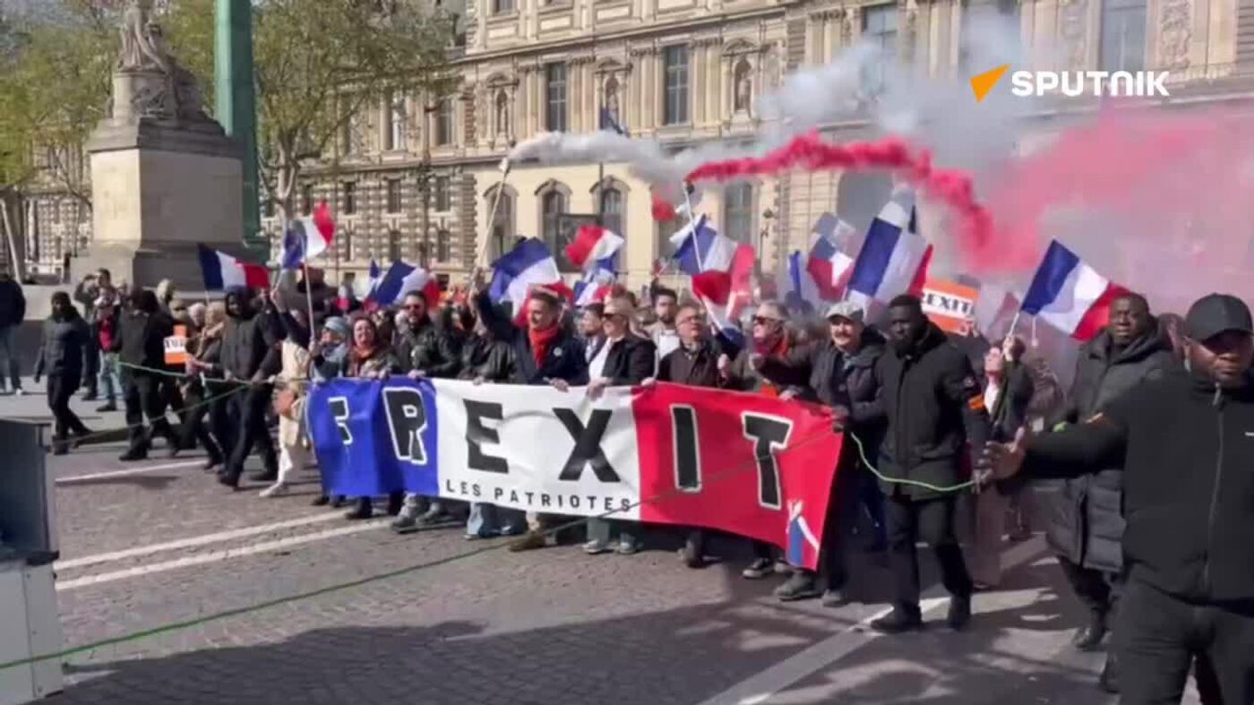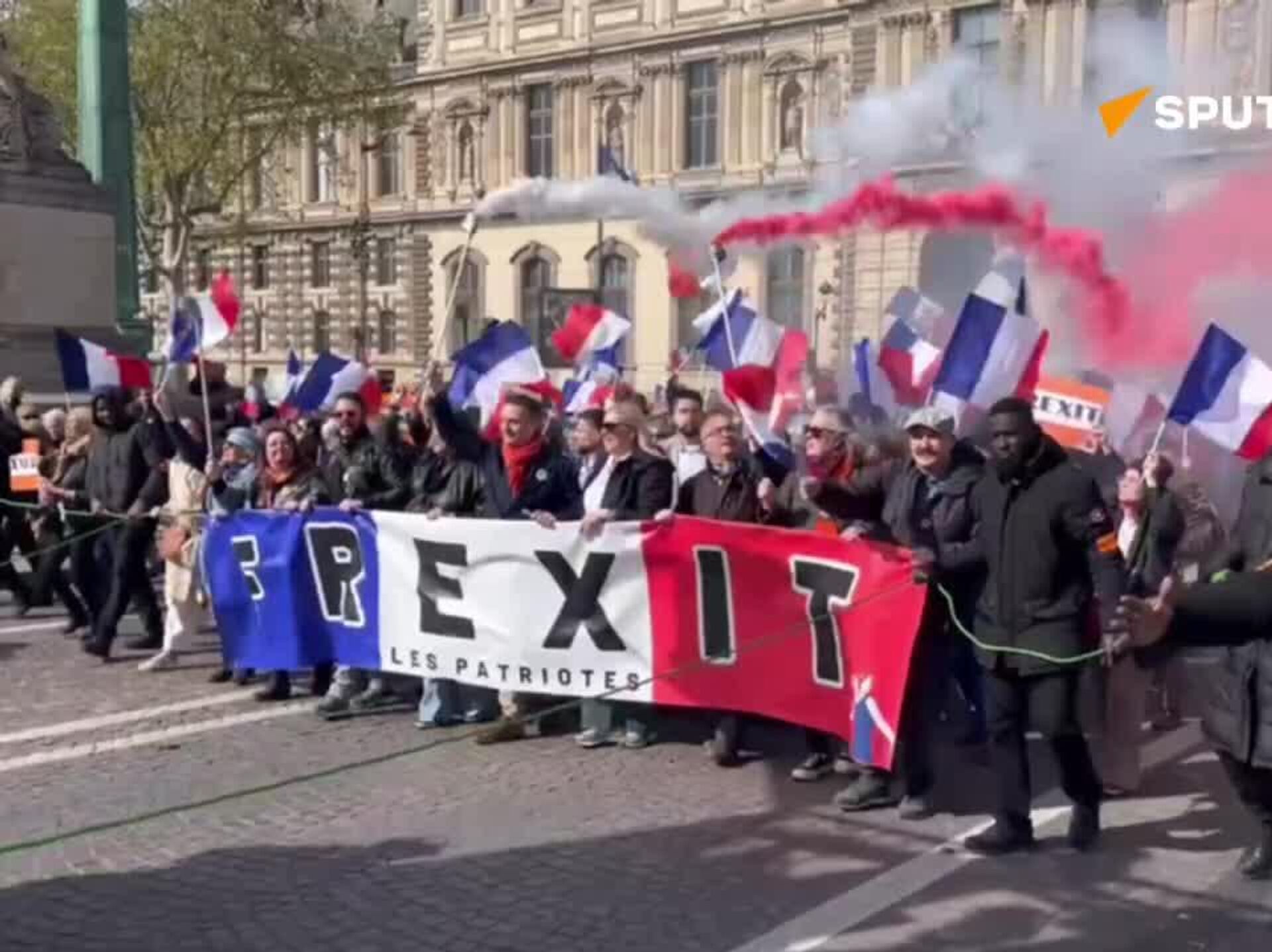 راهپیمایی مخالفان جنگ: فیلیپو، رهبر حزب «میهن پرستان» در راهپیمایی در پاریس که با شعارهای ضدجنگ و ضداتحادیه اروپا برگزار شد، پرچم اتحادیه اروپا را از جایگاه سخنرانان پایین انداخت و گفت: «ما میخواهیم از شر این پرچم فریب خلاص شویم! فرکسیت!».