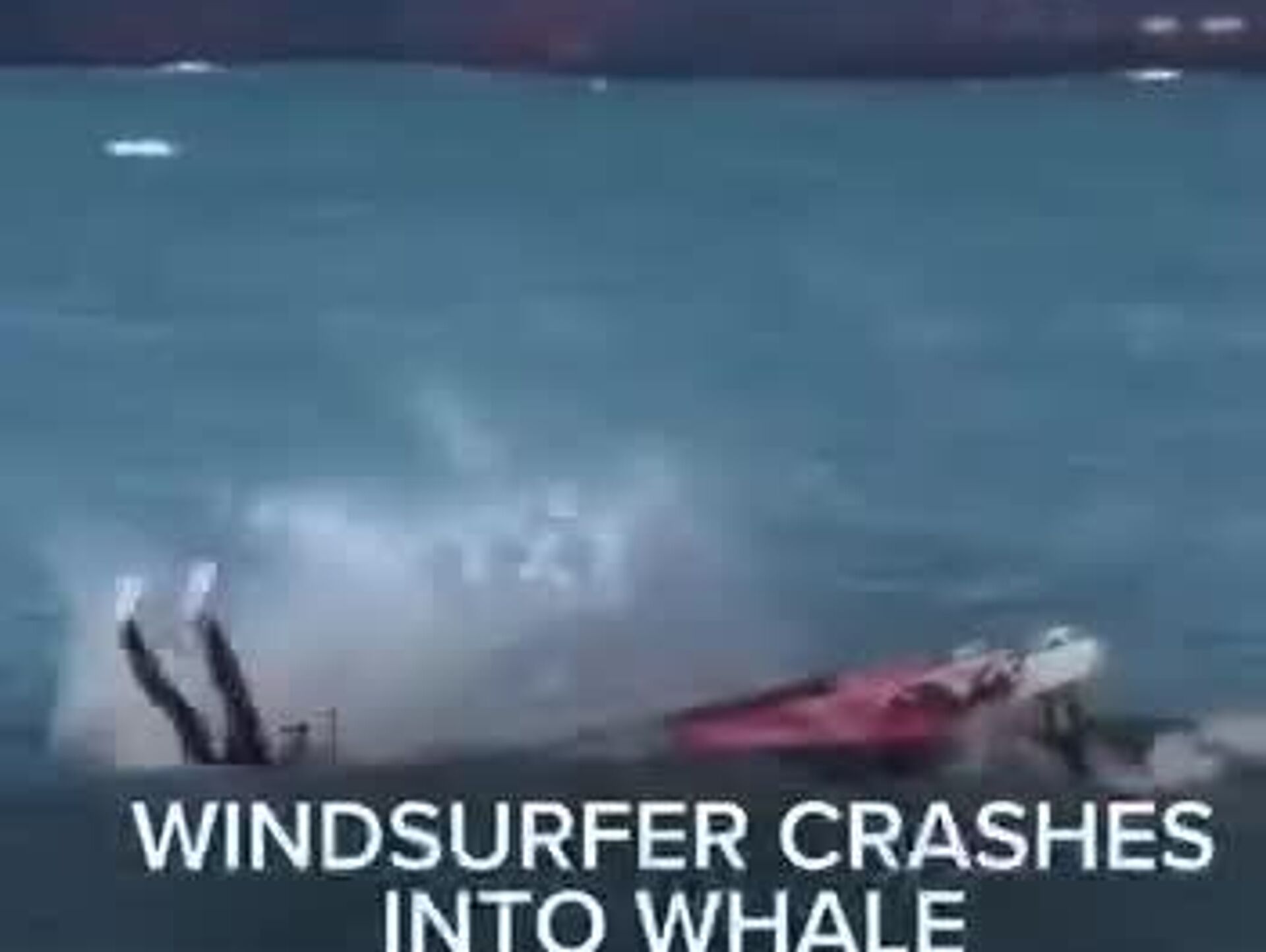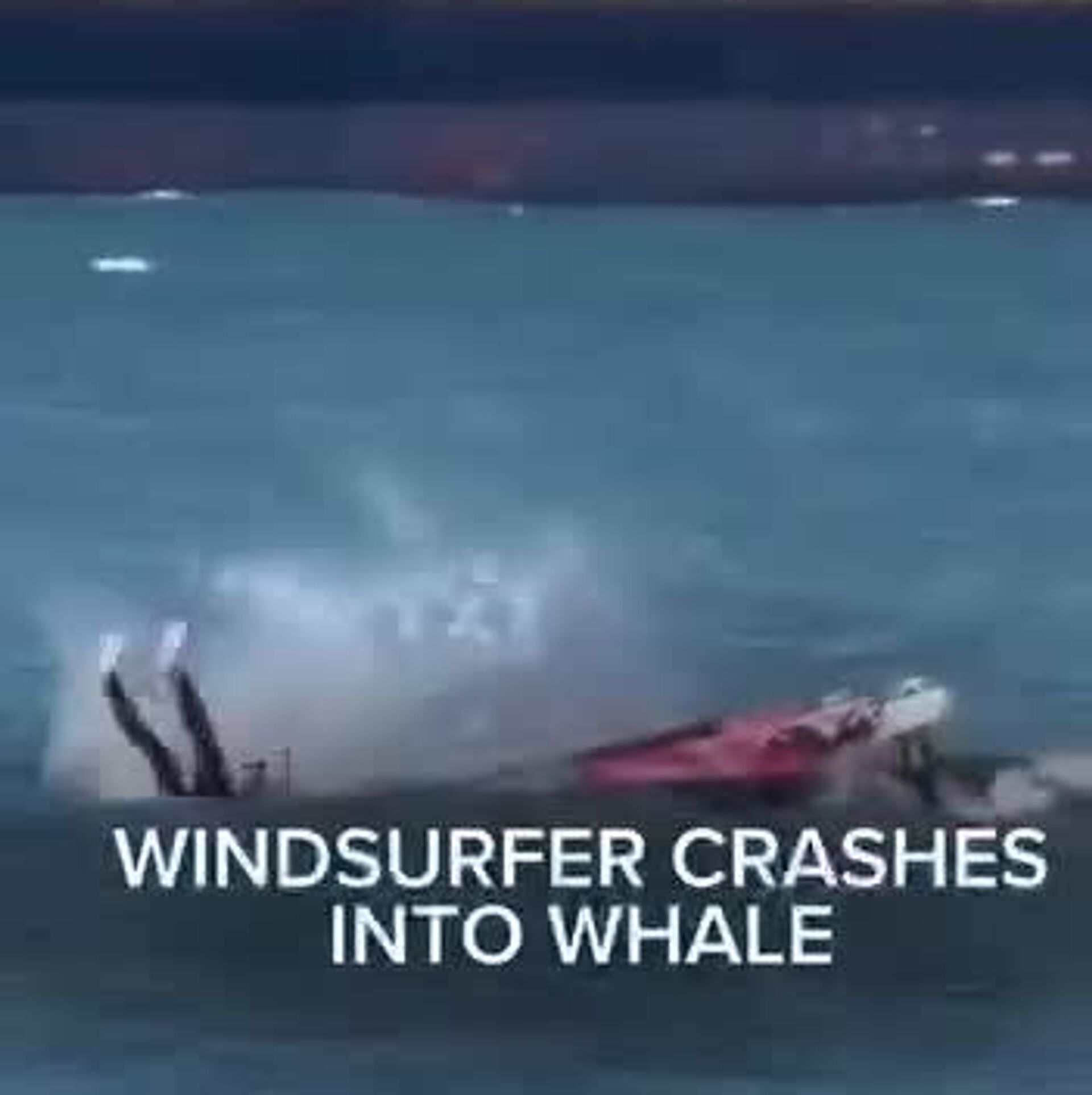 یک موجسوار در سخلیج سانفرانسیسکو در حال موجسواری بود که ناگهان با نهنگ غولپیکر که از زیر آب به بیرون پرید برخورد کرد که - خوشبختانه حال هر دو حیوان خوب است.