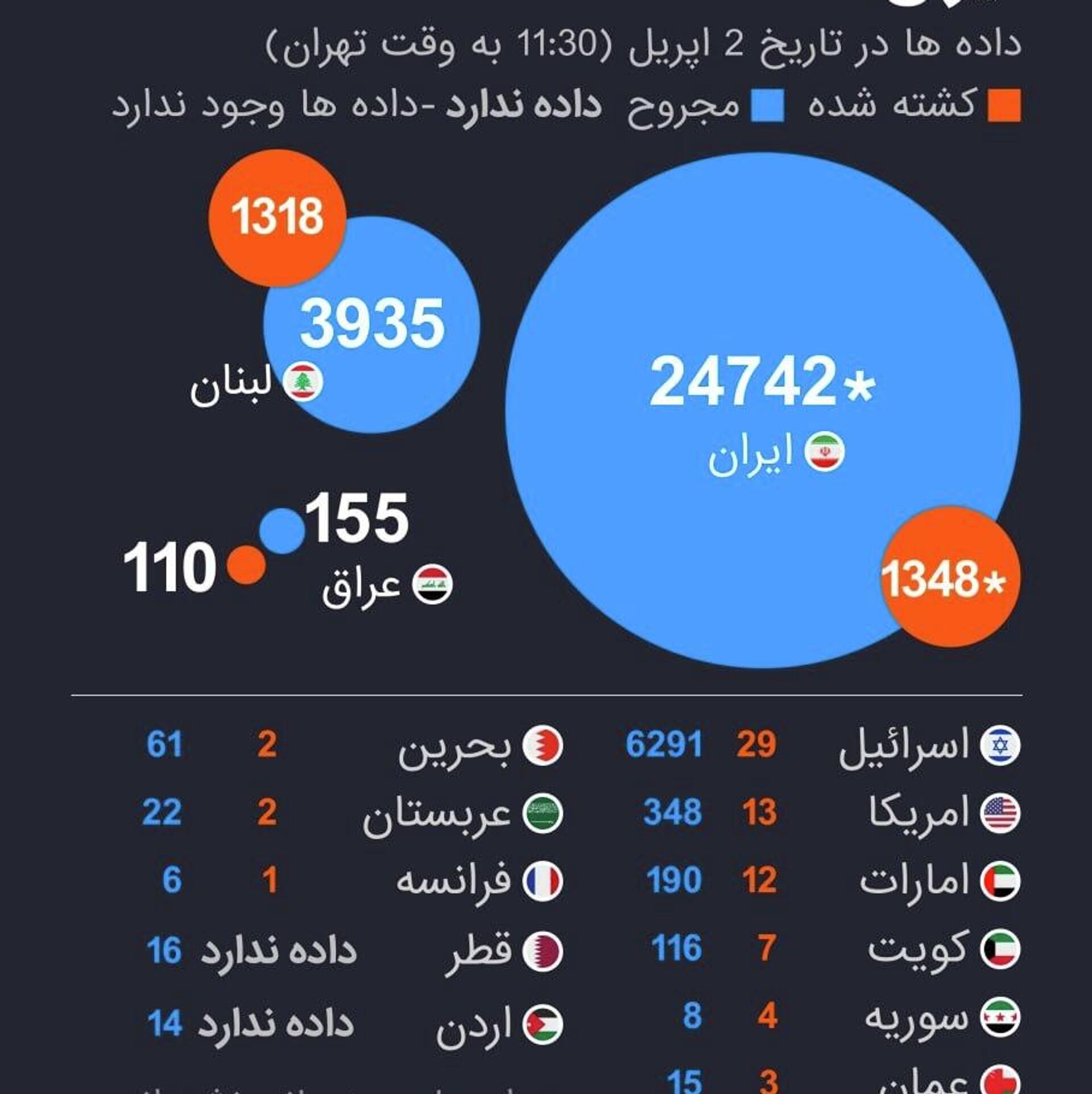 18:28 02.04.2026 (بازآوری شدن: 18:30 02.04.2026) آمار کشته شدگان عملیات نظامی علیه ایران تا به امروز