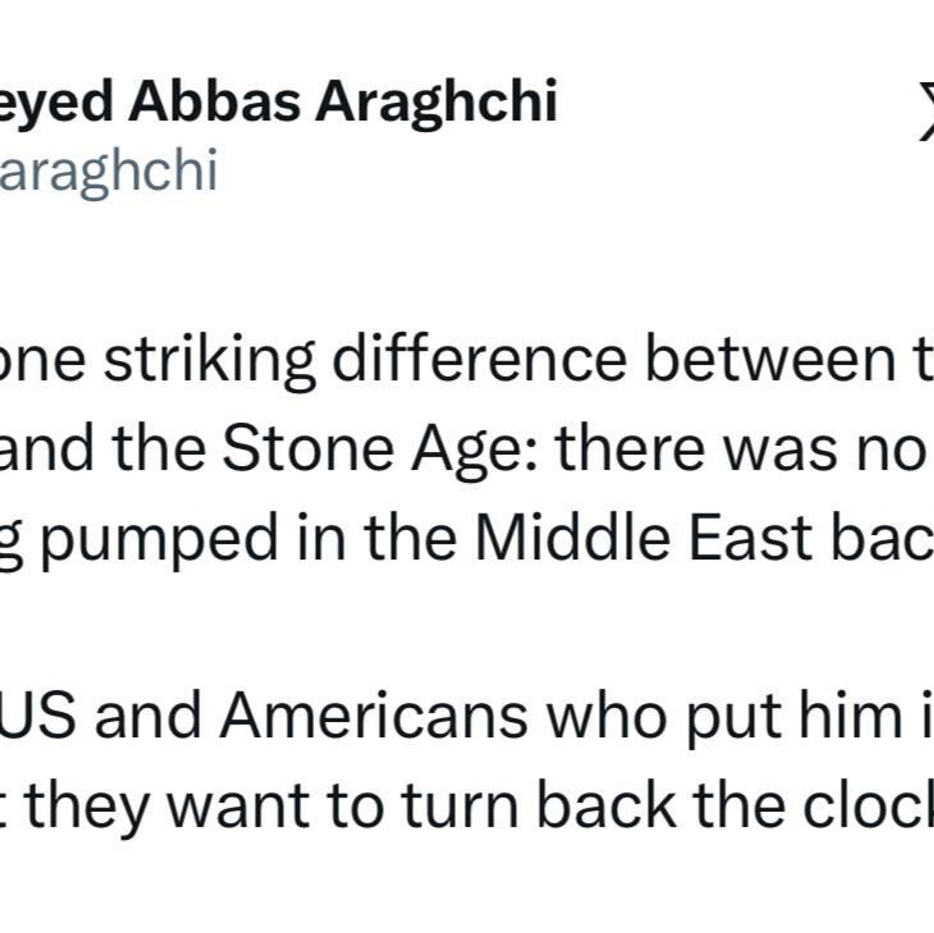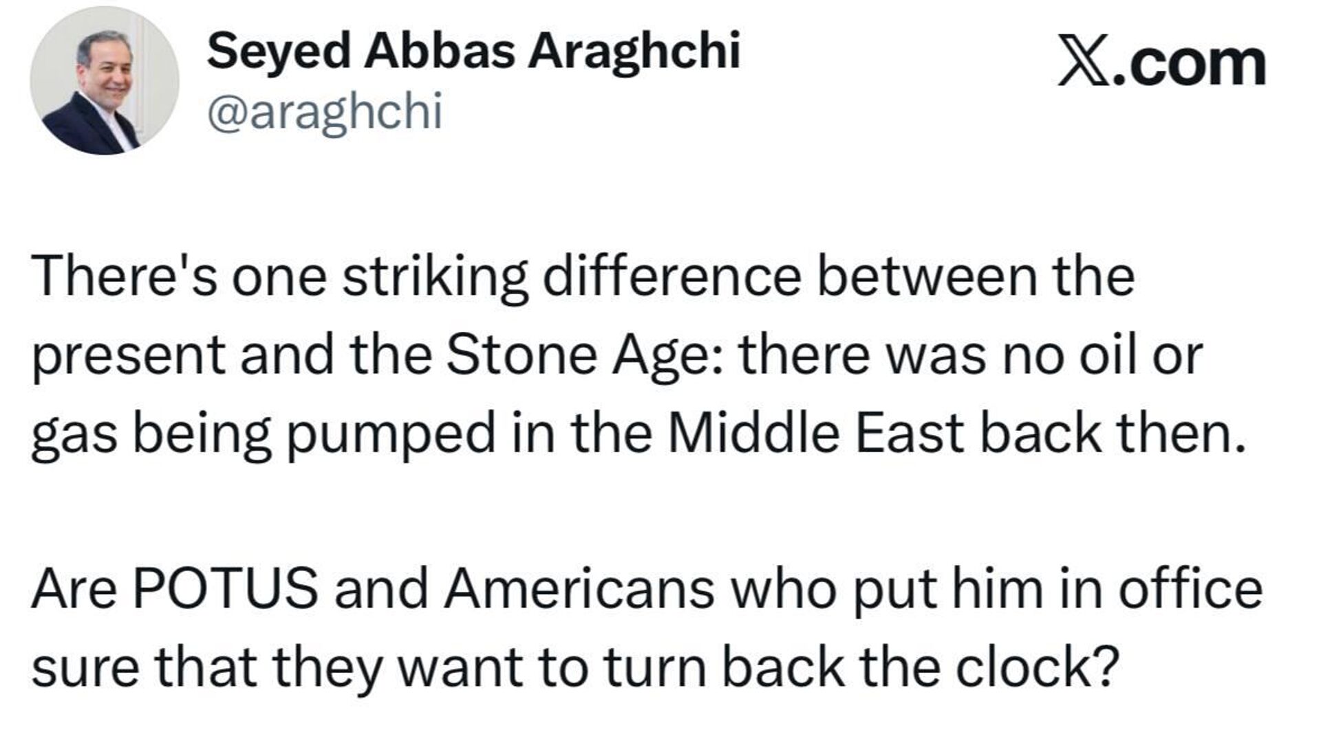◻سید عباس عراقچی، وزیر امور خارجه ایران، در واکنش به اظهارات رئیسجمهور آمریکا با کنایه گفت: «یک تفاوت چشمگیر میان عصر حاضر و عصر حجر وجود دارد: در آن زمان هیچ نفت و گازی در خاورمیانه استخراج نمیشد.»