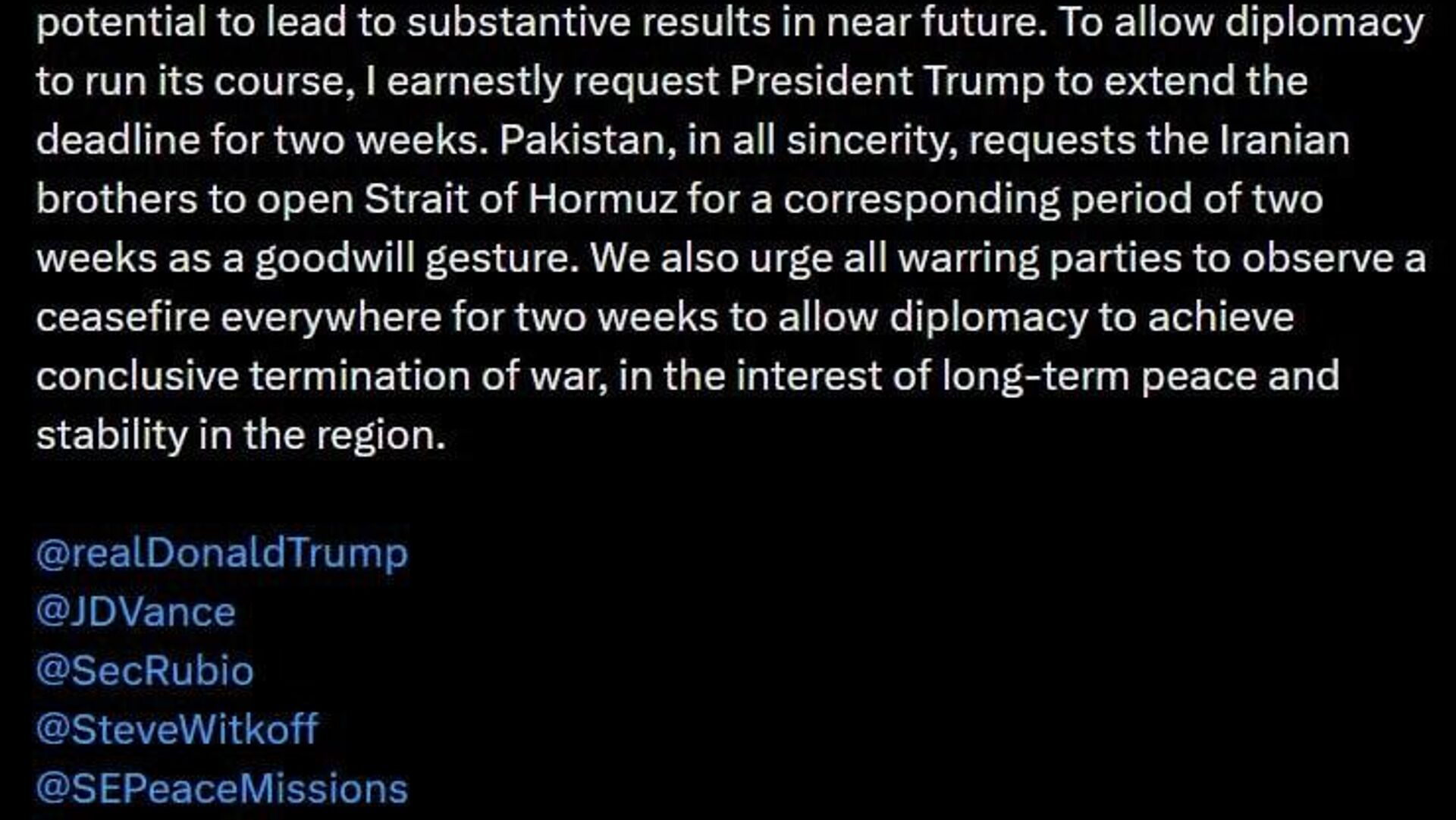 نخستوزیر پاکستان همچنین از ایران خواست در همین بازه زمانی، «بهعنوان نشانهای از حسن نیت»، تنگه هرمز را باز کند.
