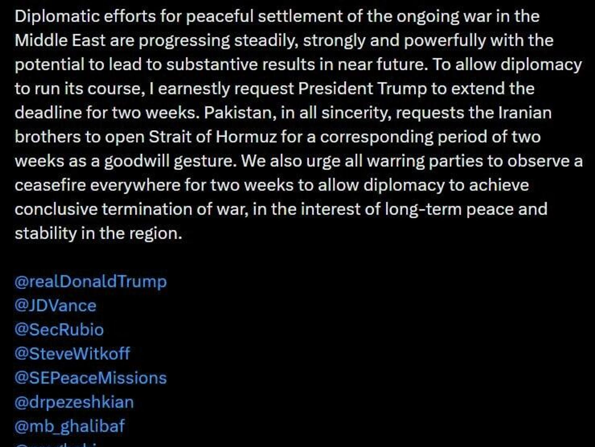 از برادران ایرانی درخواست میکنم تنگه هرمز را به مدت دو هفته به عنوان نشانهای از حسن نیت باز کنند.