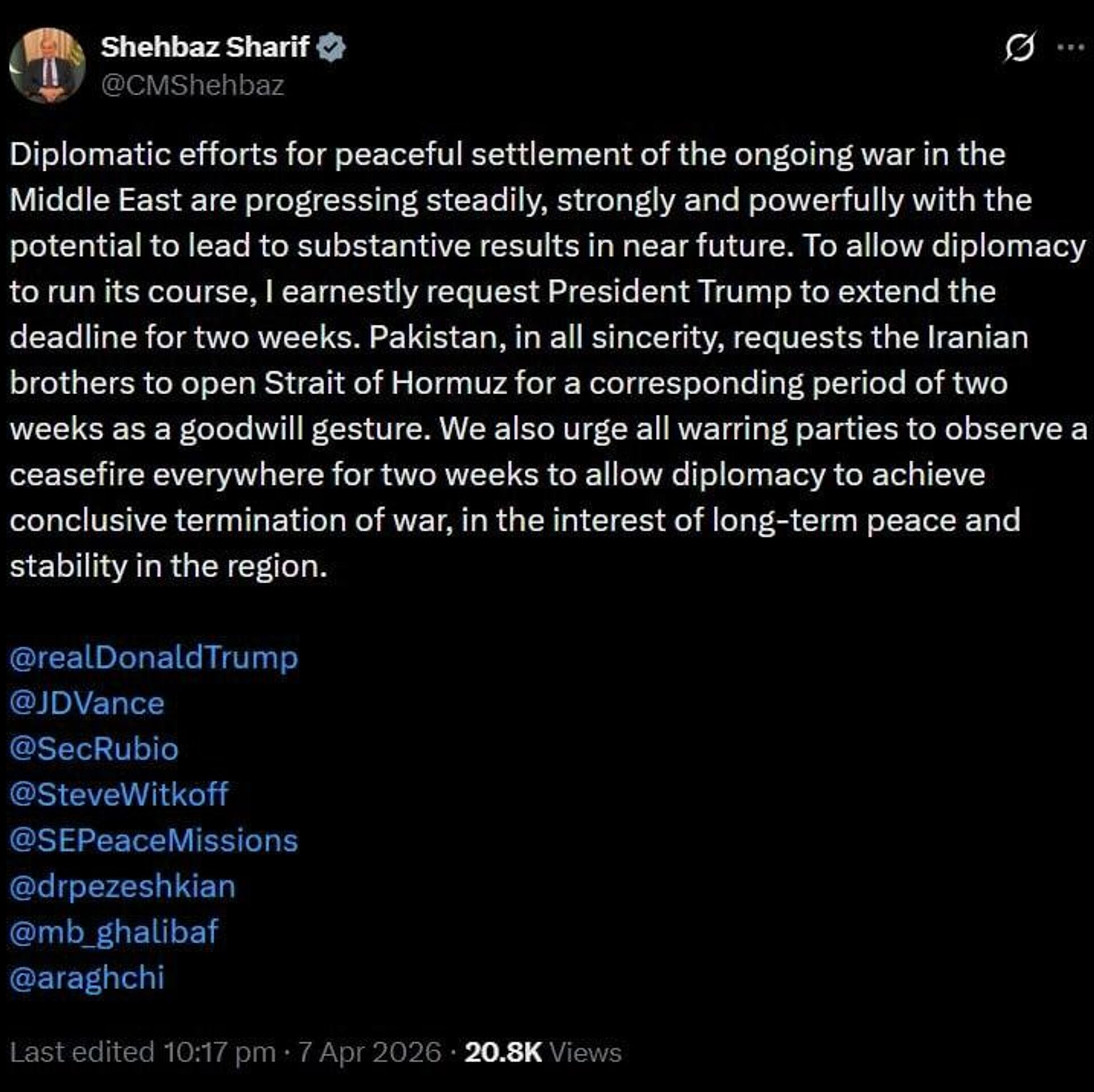 شریف در پیامی در شبکه اجتماعی ایکس نوشت تلاشهای دیپلماتیک برای حل مسالمتآمیز جنگ جاری در خاورمیانه «بهطور پیوسته، قوی و مؤثر» در حال پیشرفت است و میتواند در آینده نزدیک به نتایج ملموسی منجر شود.