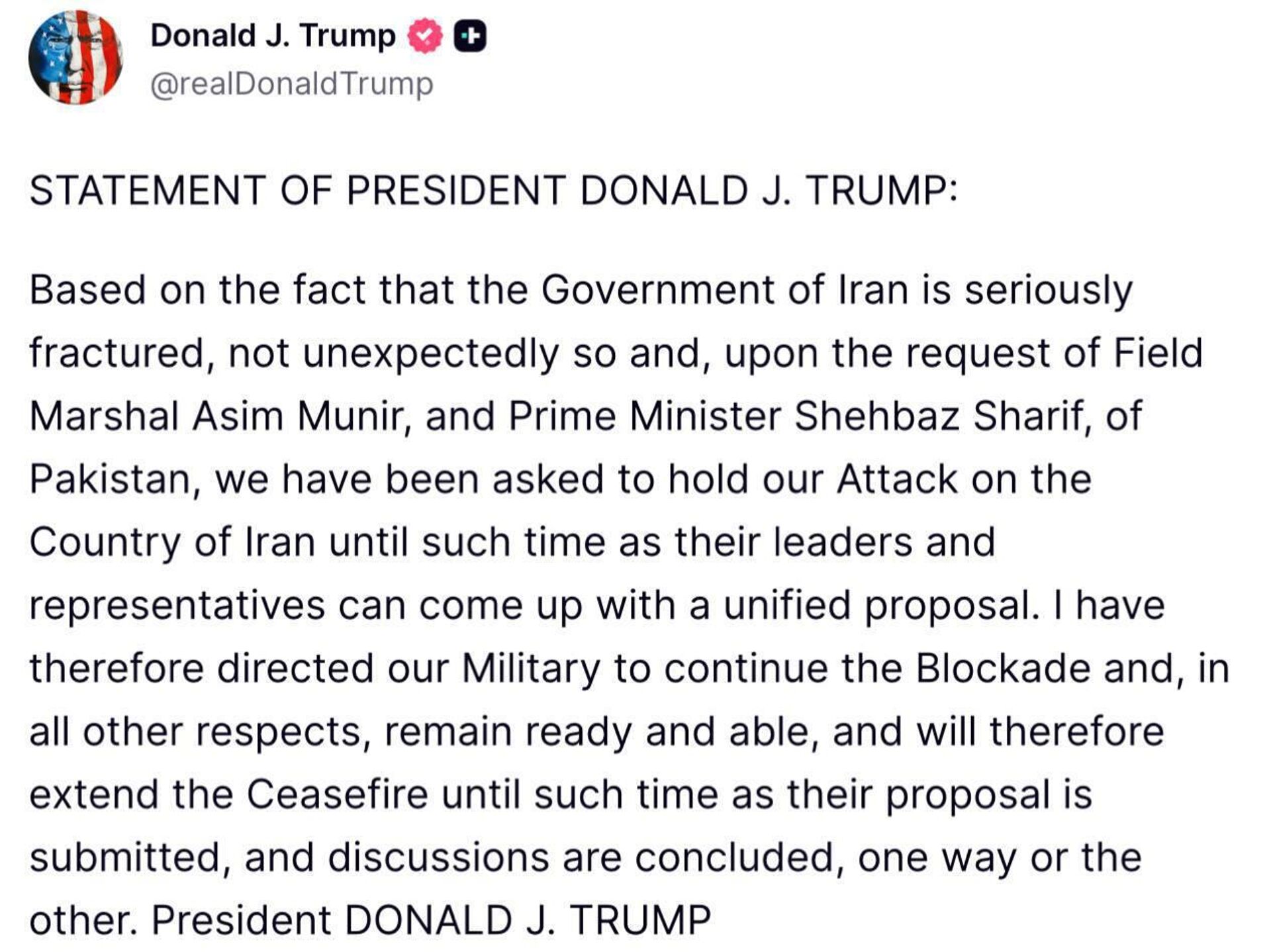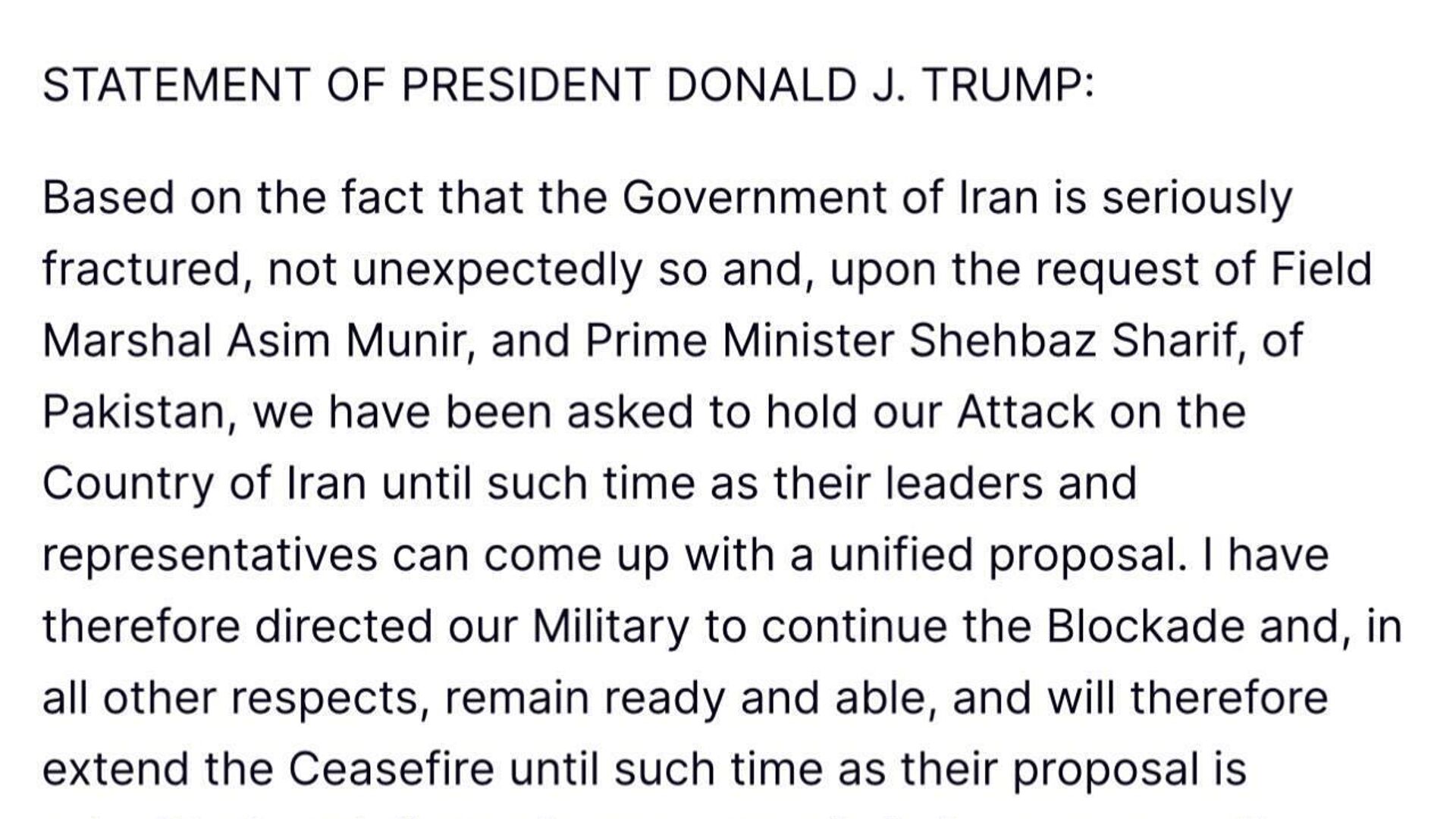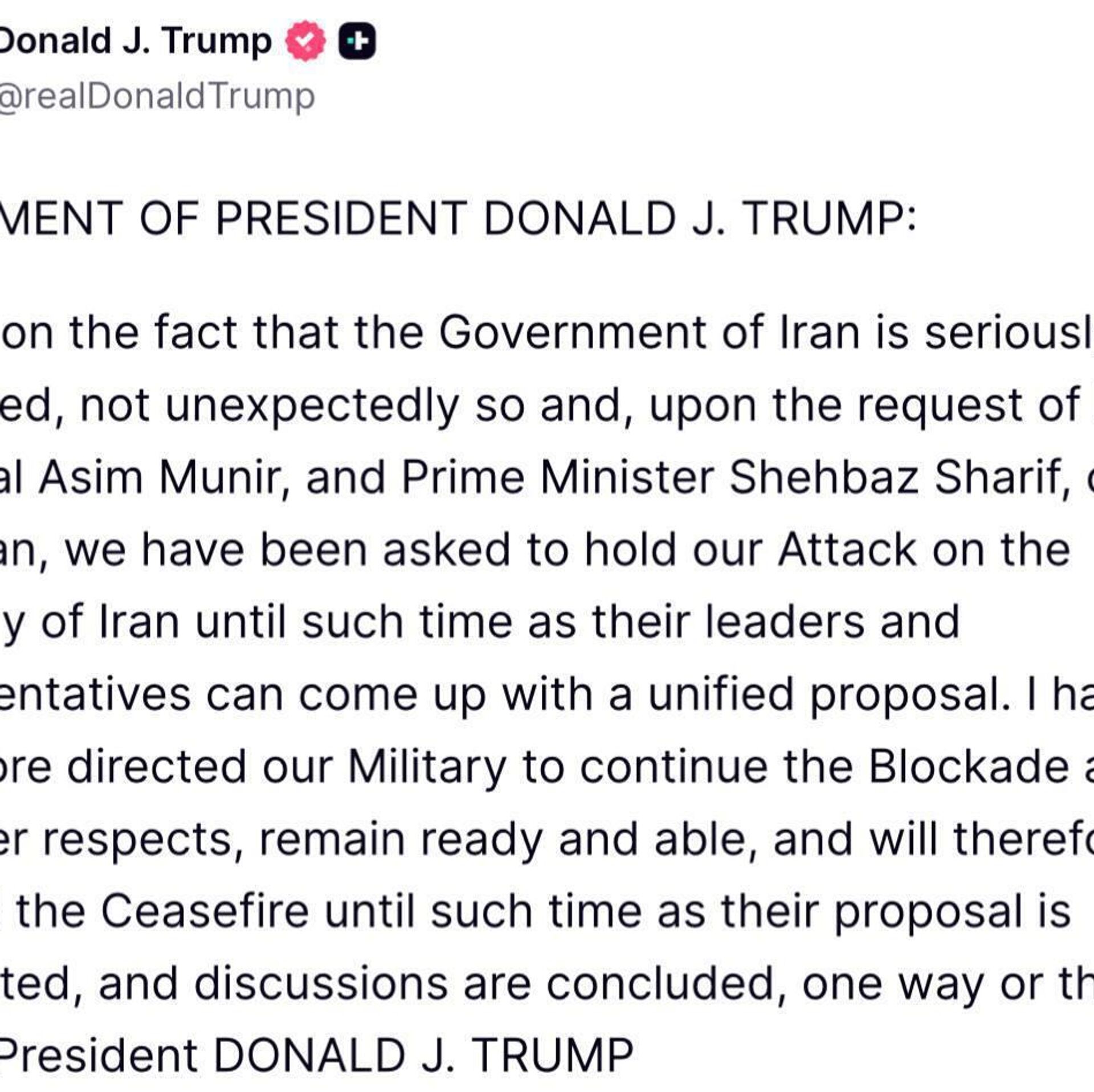 با توجه به اینکه دولت ایران حسابی چنددسته شده که چیز عجیبی هم نیست، و به درخواست فیلد مارشال عاصم منیر و نخستوزیر پاکستان شهباز شریف، از ما خواستن فعلاً حمله به ایران رو نگه داریم تا وقتی که رهبران و نمایندههای ایران بتونن یه پیشنهاد واحد و مشخص بدن.