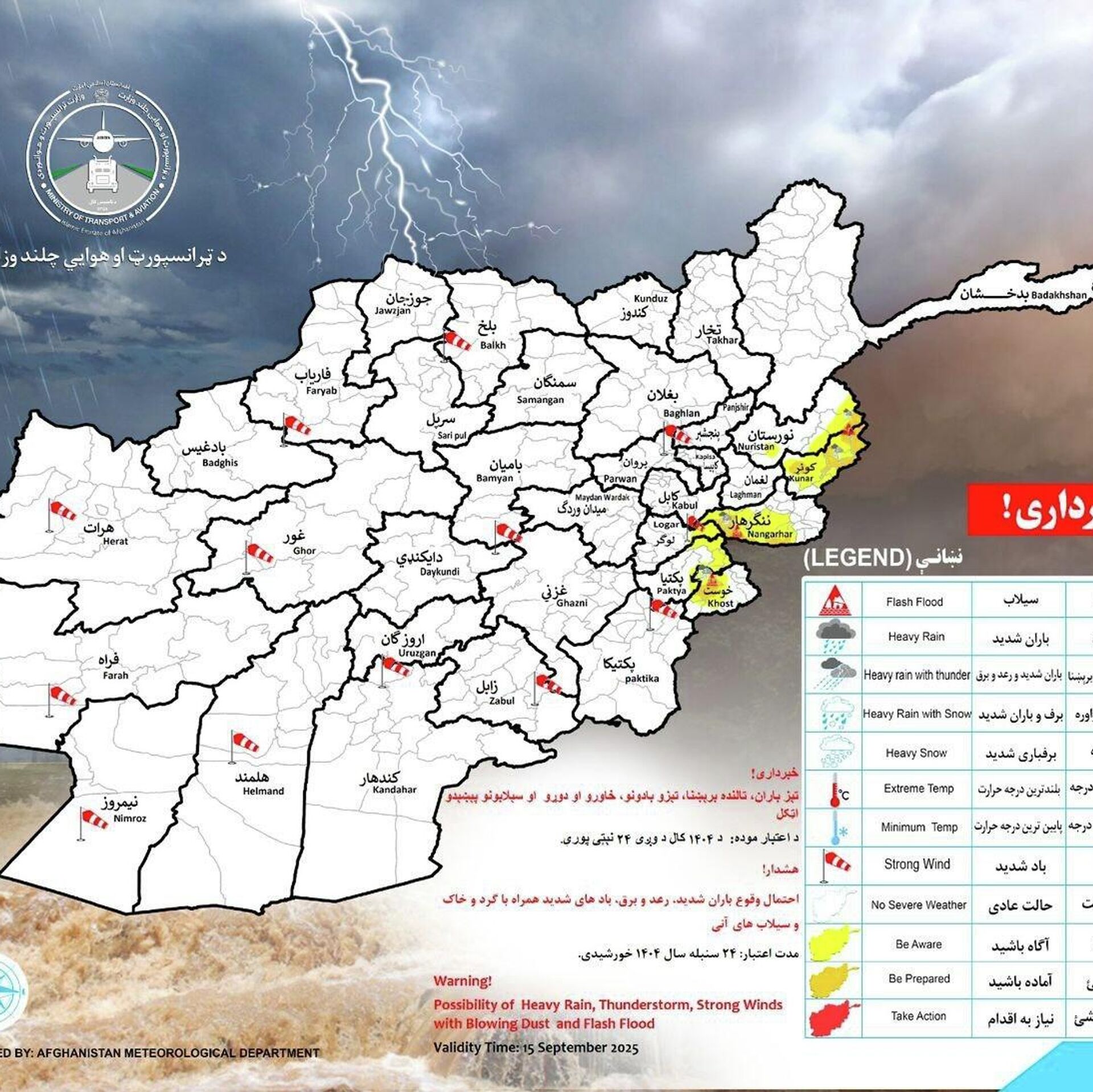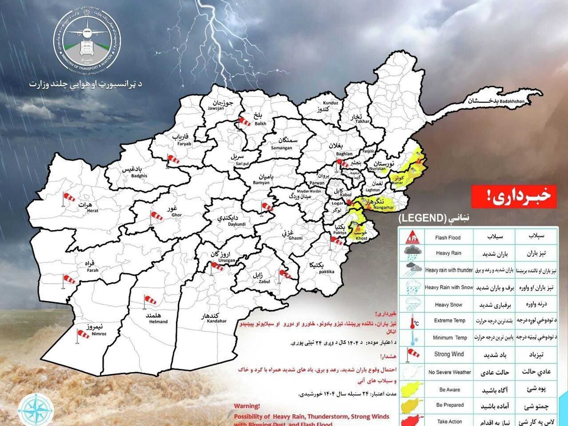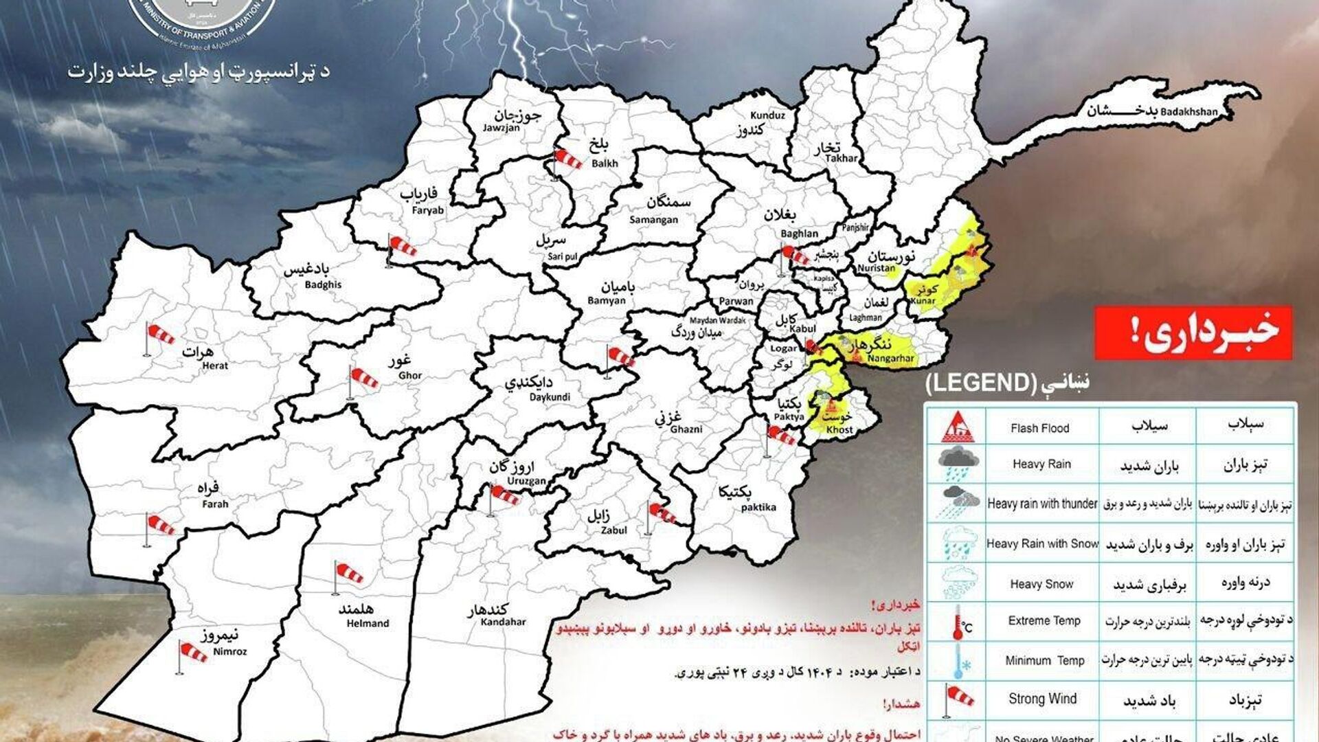 ریاست هواشناسی وزارت ترانسپورت و هوانوردی امارت اسلامی افغانستان احتمال بارش باران و سرازیرشدن سیلاب را در 23 ولایت کشور پیشبینی کرده است.